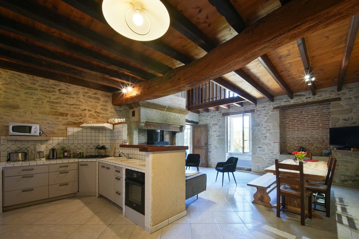 Dođite da se napunite energijom i pronađete sebe, sami ili u dvoje, u ovoj potpuno renoviranoj čašici od 80 m2, smještenoj u srcu lijepog starog sela Žansak u Žirondi, s pogledom na dolinu koji oduzima dah, gdje možete da se divite zalasku sunca. Osvojiće vas svojim starinskim šarmom, netipičnim i urednim dekorom i neuporedivom udobnošću. Za prvo noćenje nudimo vam doručak u francuskom stilu!