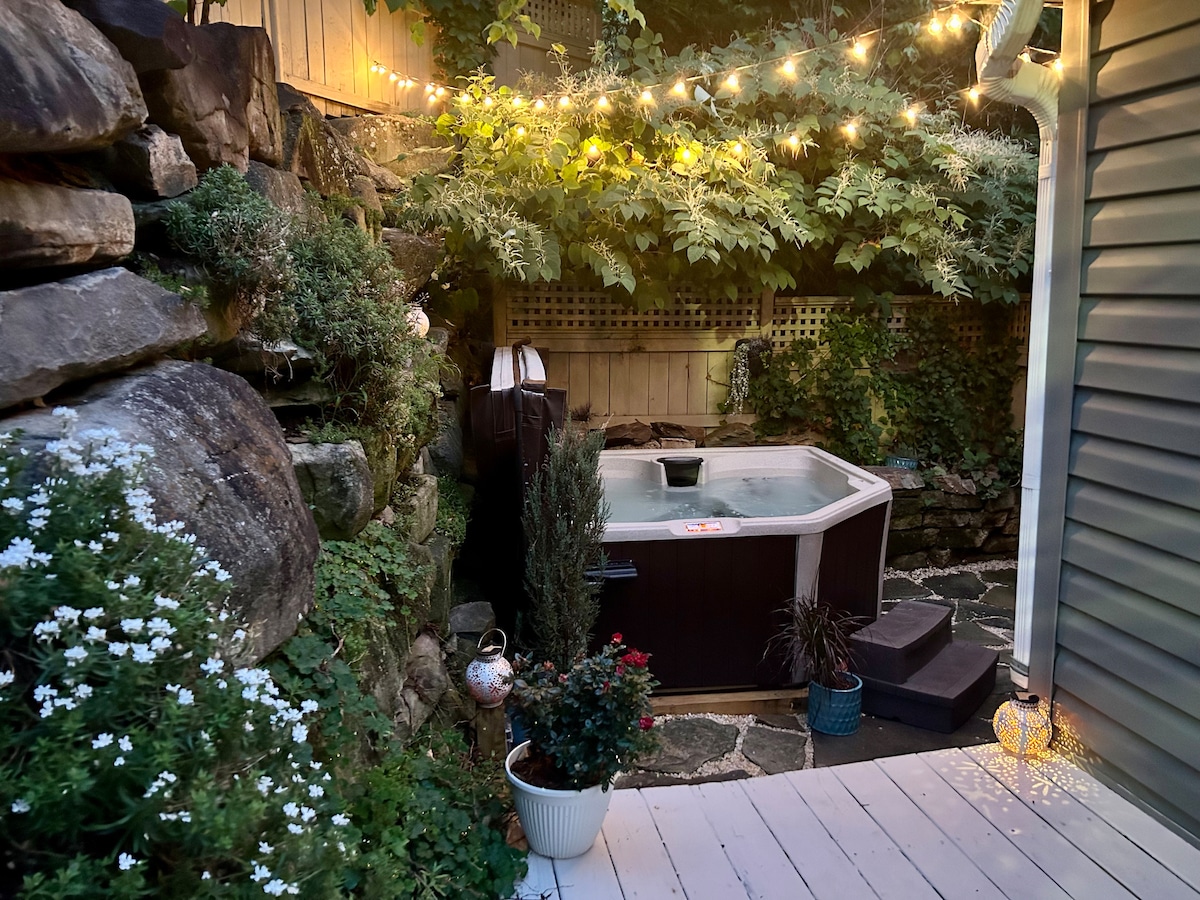 Potkrovlje koje je dizajnirao arhitekta i udoban stil 1 spavaća soba 2 kupatila (625 kvadratnih stopa) sa pogledom na drveće i DT AVL. PVT HIDROMASAŽNA KADA, kompletna kuhinja, veliki trijem u RockWall Garden Nook/Lounge Entrance, Bdrm Deck. Smješten među velikim drvećem u srcu prelijepog Ašvila. PROŠETAJTE do centra grada za 7 minuta. BESPLATAN PVT PARKING! Iconic Pack Square, South Slope, French Broad Chocolate Lounge among all breweries, restaurants n coffee houses 10 min Walk. Udobno. Opuštajuće. Romantično. Moderni otvoreni stan povezan sa domom