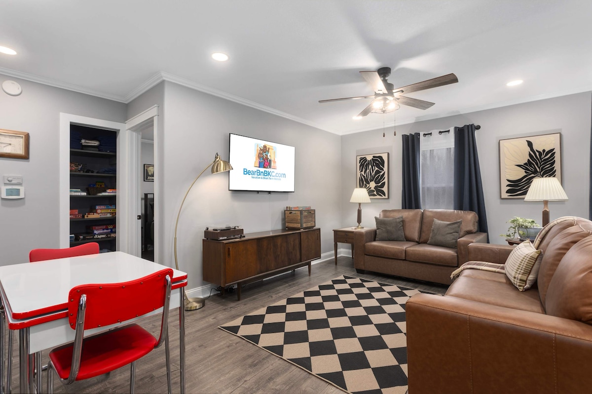 S ovog modernog odmorišta na vrhu brda pruža se pogled na horizont – to je vaša baza na vrhu grada za FIFA Svjetsko prvenstvo u fudbalu, muzeje, noćni život, dječje atrakcije i još mnogo toga. Nalazite se na 5–15 minuta od većine atrakcija u Kanzas Sitiju – ili možete pješice da odete do restorana Slap's BBQ i obližnjih barova u okolini. Ima visoke drvene grede, pažljivo uređen kafić i sobu za igre, kao i odličnu posteljinu, namensku kancelariju i pažljivo odabrane detalje na 185 kv. m prostora u kojem možete da se opustite. Idealno za grupe od 4–6 osoba koje traže nešto jedinstveno.