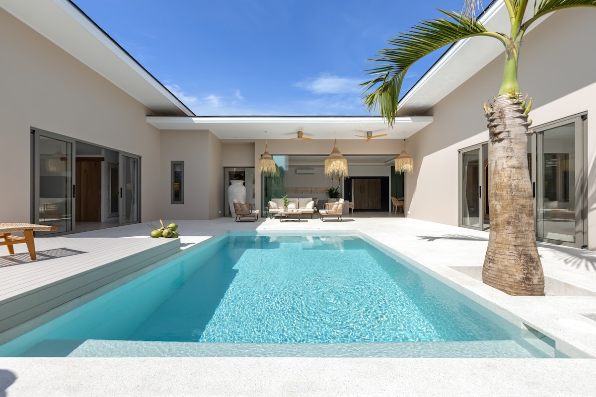 Doživite utjelovljenje tropskog luksuza u našoj izuzetnoj vili s 3 spavaće sobe na plaži Bangrak na Koh Samuiju na Tajlandu s predivnom baštom i pogledom na more koji oduzima dah u blizini popularnog ribarskog sela i plaže Big Buda. Smještena u čuvanoj četvrti sa sopstvenim privatnim pristupom plaži, ova elegantna oaza je savršen spoj udobnosti, klasičnog modernog dizajna i prirodnih ljepota.