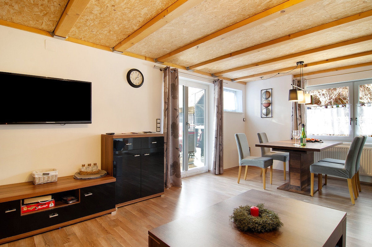 Stan se nalazi u podrumu naše kuće i ima zaseban ulaz. Sastoji se od dnevnog boravka/spavaće sobe, kuhinje i kupatila. Dnevna/spavaća soba je svetla i prijateljska, opremljena bračnim krevetom ležeći prostor 1,60 x 2,00 m. Pomoćni ležaj 0,80 x 1,90 m ili dečiji putni krevetić za treću osobu, ako je potrebno. Oba nisu moguća u isto vreme. Kupatilo sa tušem i toaletom. Stan ima potpuno opremljenu kuhinju. Visoka stolica će biti obezbeđena ako je potrebno.