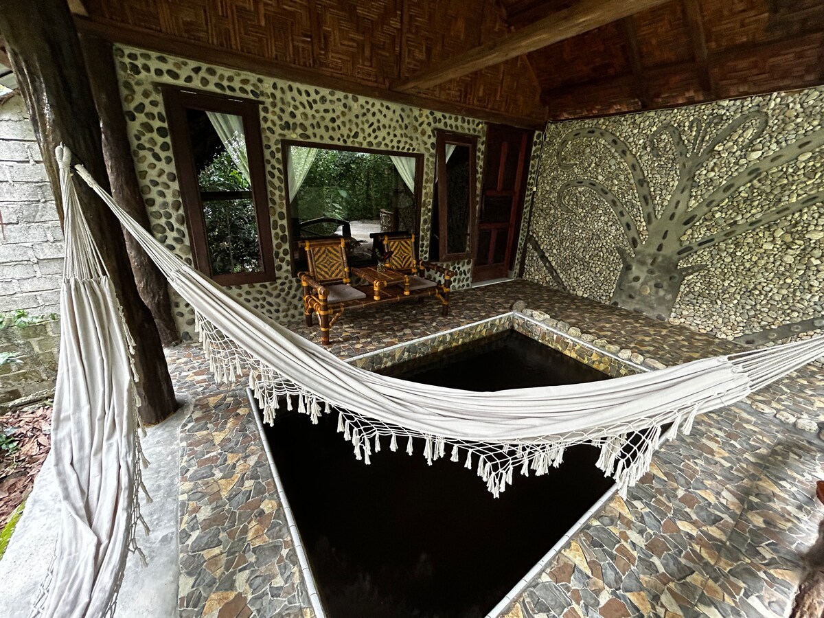 To je kuća od kamena, bambusa i drveta. Izgrađen 100% ručno sa lokalnim materijalima 2015. godine. Nalazi se usred plantaže pirinča u ruralnom području Bukit Lawanga i na samo 10 minuta hoda od autobuske stanice. Savršeno za opuštanje kao par ili sa prijateljima. Ima pogled na planine, zalazak sunca i izlazak sunca. Jedinstvena i autentična kuća u Bukit Lawangu