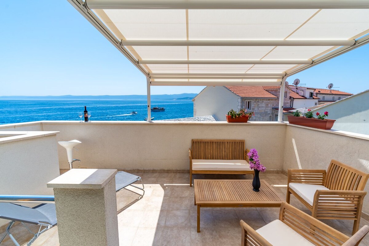 Luksuzni stan s pogledom na more na odličnoj lokaciji u Supetru, na ostrvu Brač. Stan s terasom okrenutom prema moru s jedne strane, prema luci i crkvi s druge strane pružiće vam jedinstven osjećaj stapanja sa ostrvom. Nekoliko minuta šetnje do obale, nekoliko minuta od mora, sa restoranima i barovima u blizini, omogućava vam da uživate u mirnom okruženju, a ipak u blizini svih sadržaja. Džin i tonik mogu da dodaju samo bolju dimenziju celom doživljaju.