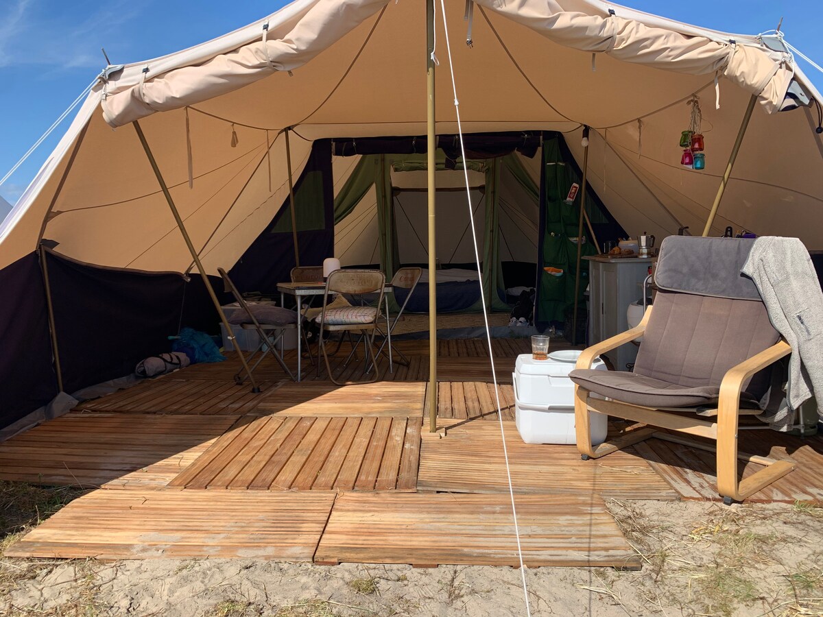 Potpuno opremljen šator. Šator otporan na vetar, sa velikom tendom, potpuno zatvorivim prostorom za spavanje koji se može koristiti u dva dela za 4 osobe. 1 bračni krevet (sa dušekom) i 2 dušeka za spavanje. Uključujući šporet na plin x frižider x solarni panel za punjenje telefona x tablet. Šator se nalazi na crvenom delu kampa Stortemelk. Idealno sunčano mesto sa dovoljno privatnosti zahvaljujući vetrobranima na 10m od ulaza na plažu. Ne iznajmljujemo mladima mlađim od 22 godine (zbog propisa kampa).