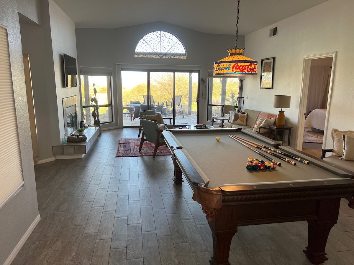 Ovo renovirano utočište u pustinji u stilu moderne sredine prošlog veka očekuje vas sa vrhunskim bračnim krevetom (širine 180–220 cm), luksuznom posteljinom od čistog pamuka, peškirima, ogrtačima i dobro opremljenom kuhinjom. U blizini grada (pola milje) sa prodavnicama, restoranima, terenima za golf, bazenima, teniskim terenima i planinarenjem samo nekoliko trenutaka. Istražite noćno nebo u ovoj registrovanoj zajednici Tamnog neba uz teleskop, off-road avanturu u državnom parku Anza-Borrego, pješačite lokalnim stazama ili jednostavno uživajte u okolnom planinskom pejzažu.