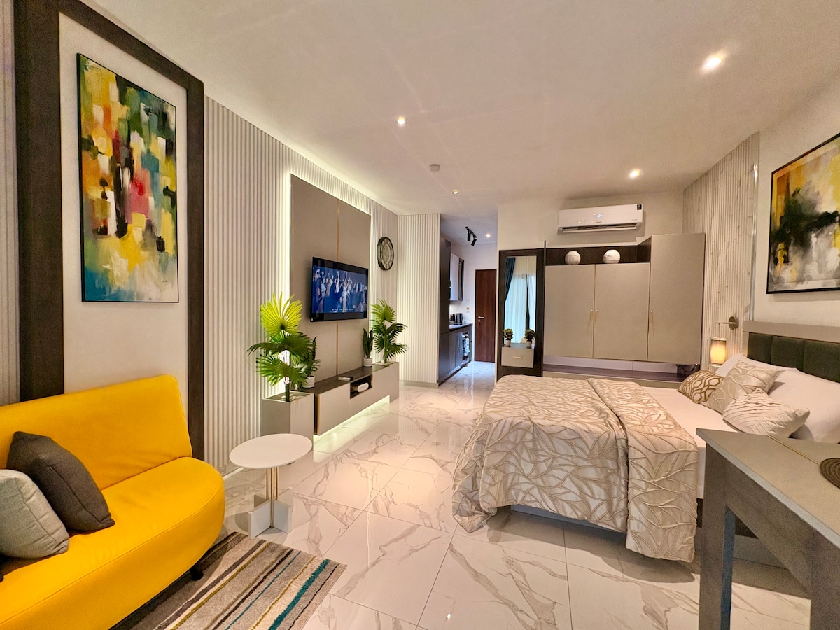 Vaše izvanredno iskustvo u Akri počinje ovdje. Rezervišite sada i saznajte zašto gosti kažu da „dom daleko od doma može da bude još bolji”. Pristup bazenu na krovu i teretani. Ovaj elegantni smještaj u zoni Airport Residential nudi udobnost na nivou hotela. Uživajte u bračnom krevetu, živopisnom žutom kauču, pametnom TV-u, brzom Wi-Fi mrežom, klimatizaciji, čajnoj kuhinji i mirnom balkonu. Bezbedno prošetajte do Aerodromskog grada, restorana, tržnih centara, kafića i Roman Ridža. 5–10 minuta vožnje do aerodroma. Savršeno za poslovne putnike, parove, samce i vikend-putovanja