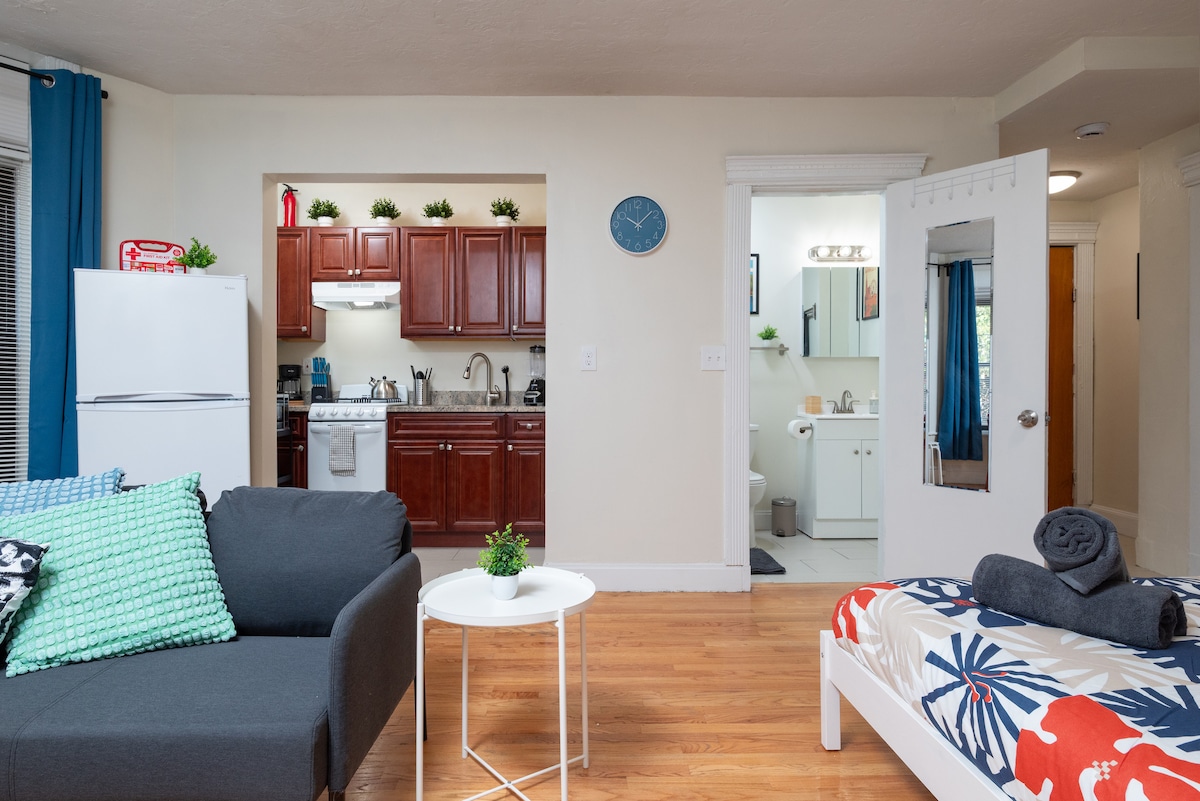 Doživite Boston u ovom nevjerovatnom atraktivnom studiju. Dolazi sa sobnom pregradom za 1 spavaću sobu kao da se osjećate! Samo 5 minuta hoda od T i u blizini Boston koledža/Harvarda, možete se baviti ukusom cijelog Bostona. Karakteristike jedinice -> Izuzetno brz WiFi -> 65-inčni SmartTV sa strimingom -> Potpuno opremljena kuhinja -> Mašina za pranje i sušenje veša -> Udoban bračni krevet (širine 150-179 cm) Idealno za poslovne putnike, parove, medicinske sestre, one koji su na bolničkom tretmanu i sve one koji žele da dožive Boston u udobnosti i miru.