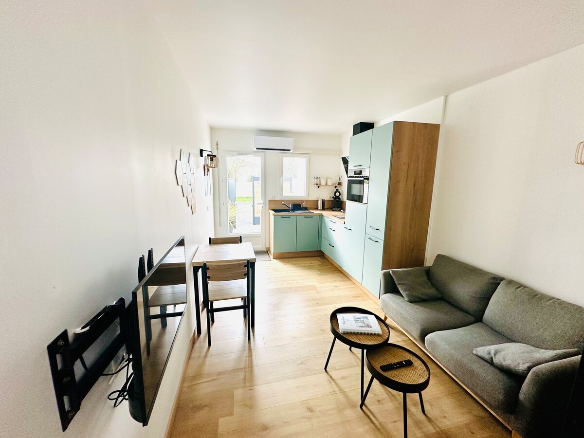 Uživajte u udobnosti ovog novog, klimatizovanog smeštaja koji se sastoji od: - na spratu sa dve spavaće sobe svaka sa tuš kabinom i WC-om - U prizemlju dnevnog boravka/kuhinje, male privatne terase i parking mjesta. Obezbeđujemo posteljinu i peškire za kupanje. Dostupna je mašina „nespresso”,rerna, mikrotalasna rerna, kuvalo za vodu, mašina za pranje sudova, mašina za pranje veša,Wi-Fi i zvučni TV. Nalazi se na 10 minuta od ulaza u La Rošel, 20 minuta od mosta Ile de Ré i 30 minuta od močvare Poitevin