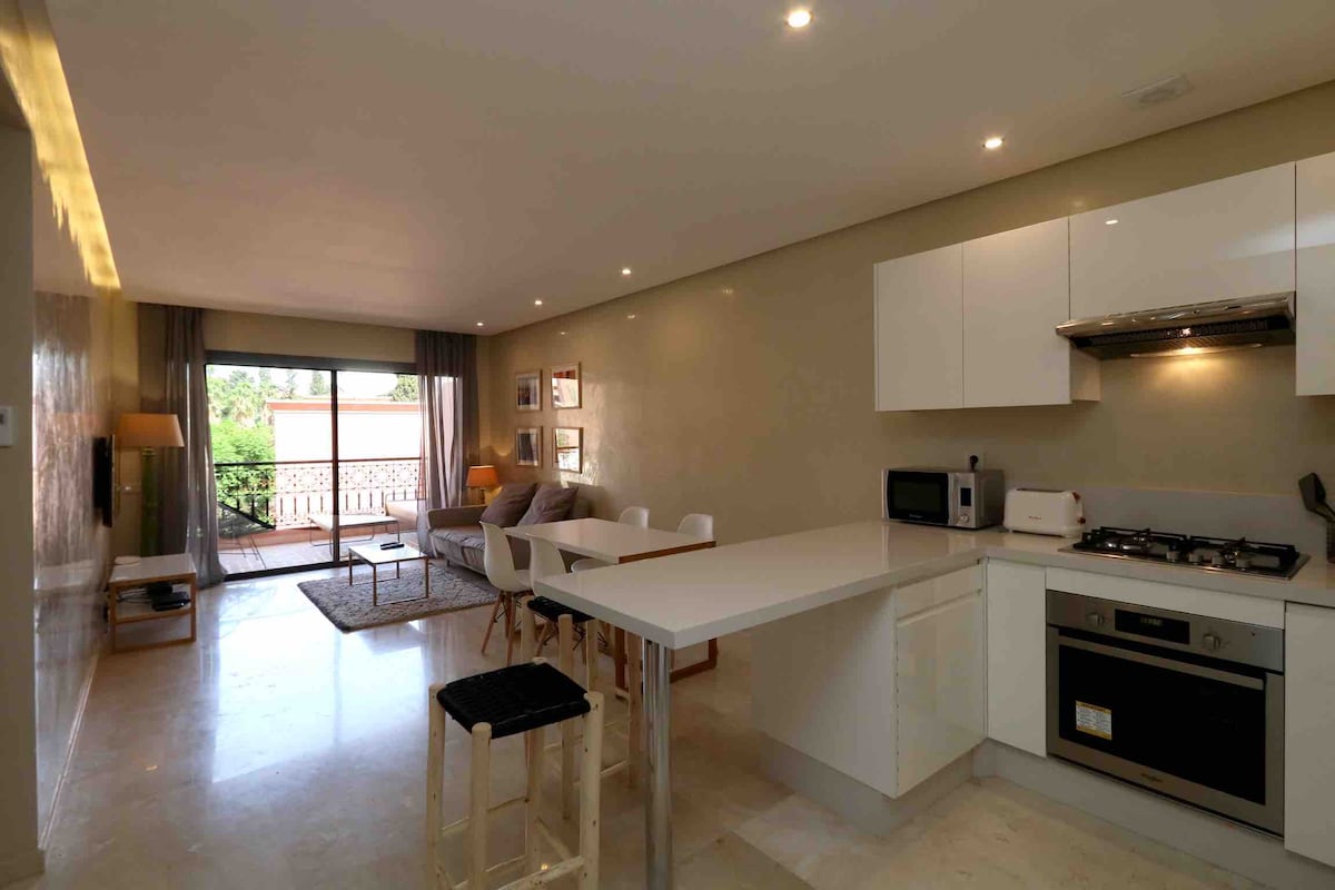 Svetao luksuzan stan i divno mesto za odmor, sa privatnom baštom u najjedinstvenijem i centralnom golf odmaralištu Prestiđa u Marakešu. Nalazi se na samo 5 minuta vožnje od aerodroma Marakeš Menara i na 5 minuta vožnje od centra Gvaliza i Médina Souksa. U odmaralištima Prestiđa pronaći ćete mir, mir i sigurnost, kao i istaknutost svim ometanjima koja će vam apsolutno trebati, kao i za kupovinu i zabavu (golf, klubovi, restorani, bioskop...)