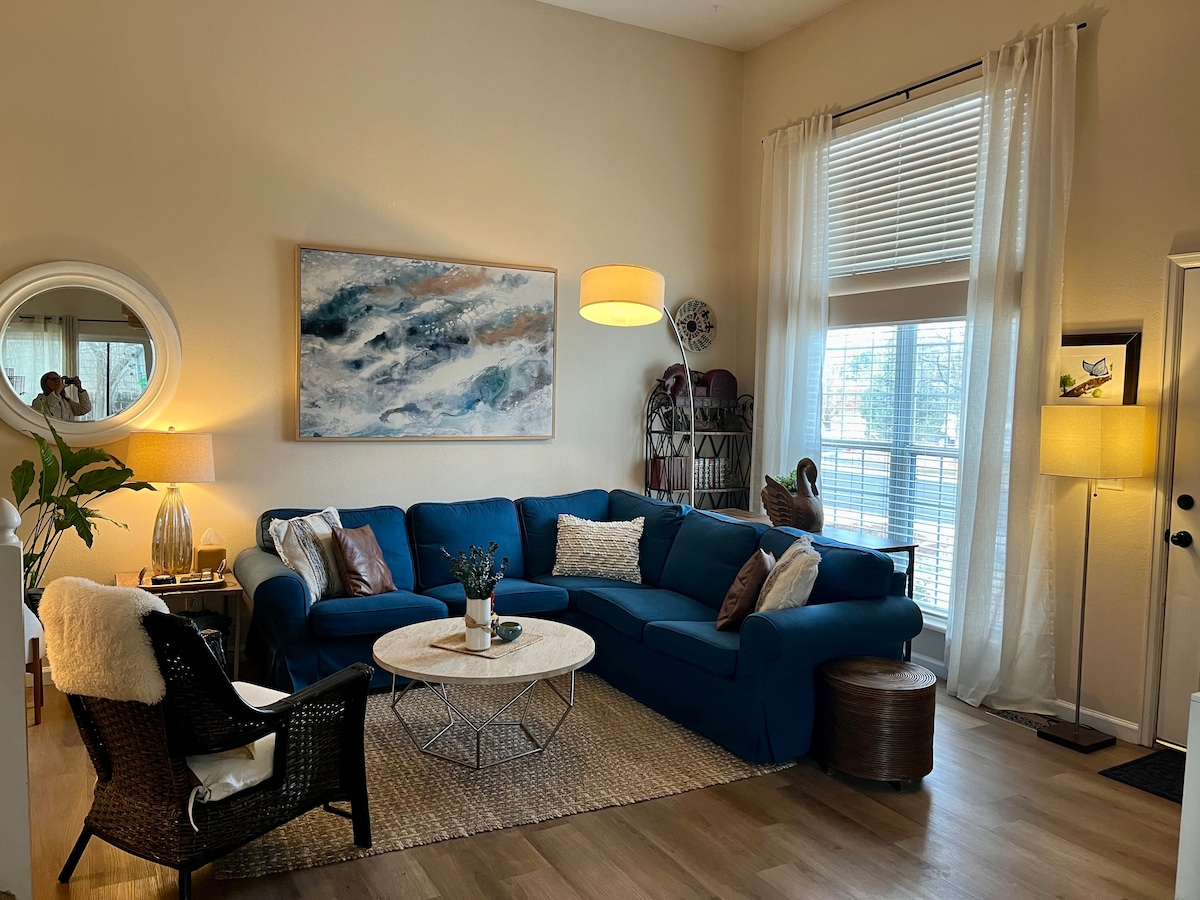 Uživajte u prostranom, nedavno renoviranom apartmanu u suterenu u našem umjetničkom porodičnom domu. Kroz zajednička ulazna vrata ulazite u svoj privatni, zaključani prostor sa 1 krevetom/1 kupatilom sa bračnim krevetom i udobnim kaučem na razvlačenje, električnim kaminom, 55-inčnim pametnim TV-om i jednostavnom čajnom kuhinjom. Cijena je niža od cijene hotela, a lako je doći do Denvera, Boldera, aerodroma DIA, autoputa I-70 i parking mjesta na prilazu. Podrška porodice Super domaćina koji žive u istom smještaju. Prostrano za dva gosta, udobno za tri, tijesno i pristupačno za četiri.