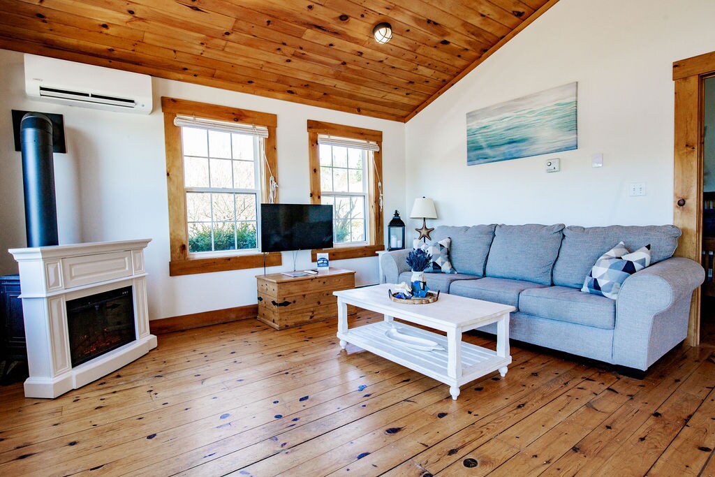 Escape to a charming, one-of-a-kind, nature retreat with NO CLEANING FEE! Boasting breathtaking tidal lake views, you will stay in a private suite in our home with its own separate entrance, soundproof ceiling, king bed, full bath, kitchenette, & AC. Unwind in the private hot tub & peaceful surroundings. Featuring a manmade beach, waterside patio with BBQ & fire pit. Next to the Rails to Trails & close to 7 beaches. Laundromat 7min away. -Cot available for 3rd guest -No Pets -No kids under 12