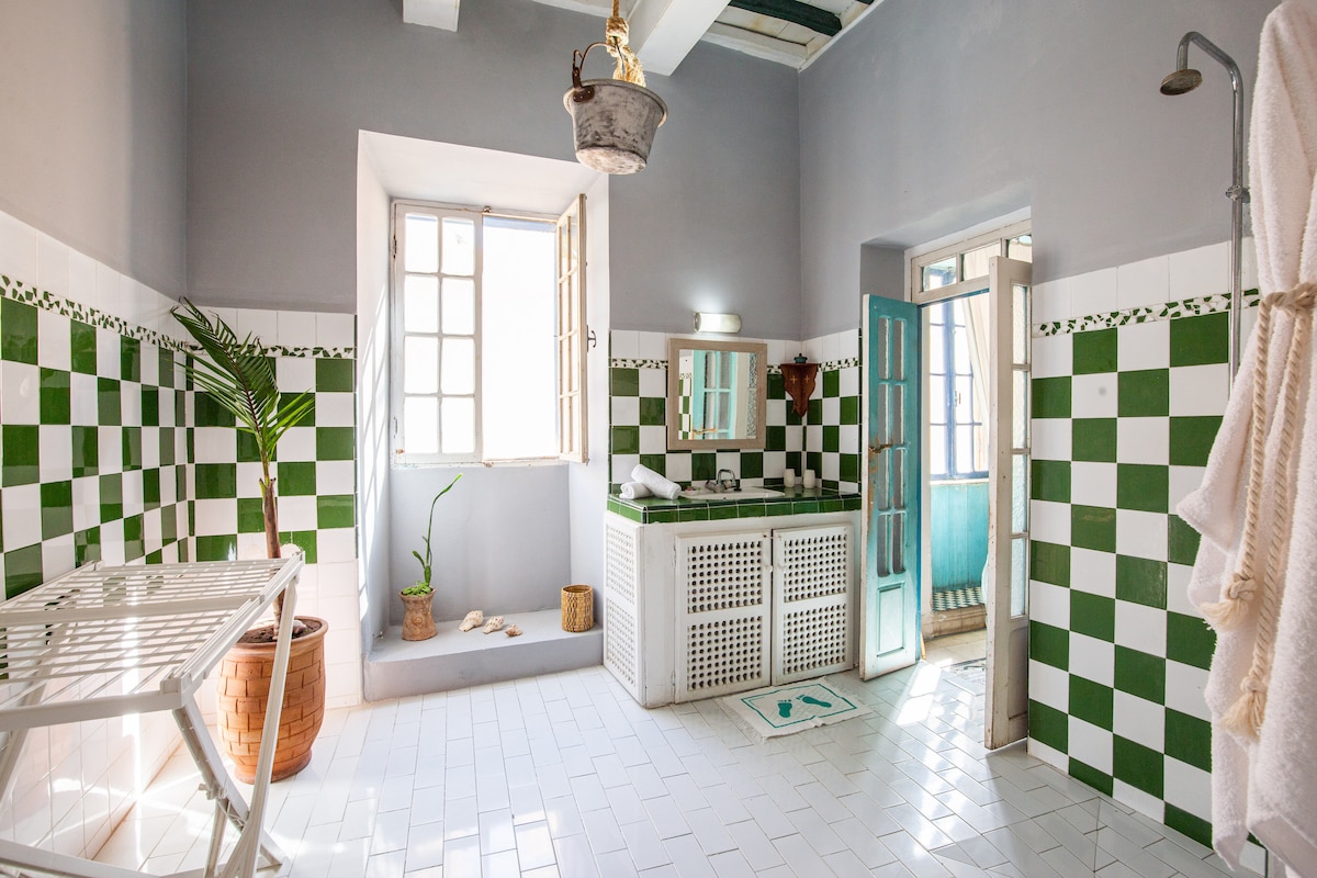 Butik apartman u srcu esaouira medine sa zadivljujućim pogledom na more. Studio je savršen za dvoje, ovaj dobro opremljen stan idealan je za kratak ili duži boravak. Privatna trpezarijska terasa i privatni sadržaji kupatila sa otvorenim tušem . Potpuno opremljena kuhinja. Uređenje apartmana je elegantno i umjetničko u kojem se nalaze lokalni .