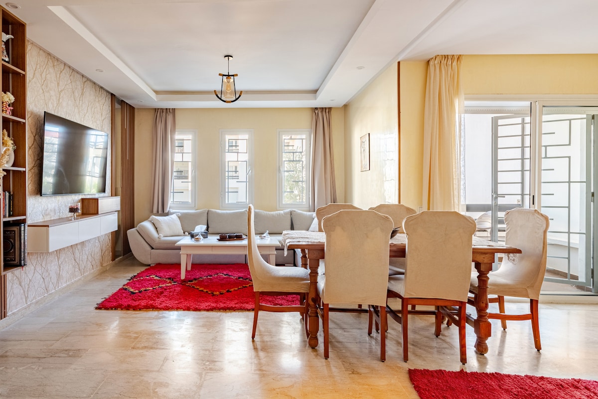 Dobro došli u Skhirat: 8 minuta do plaže🚗, 30 minuta do Rabata, 25 minuta do stadiona Moulay Abdellah (Afrički kup) i 1 sat do Kazablanke. Mirna i popularna okolina smeštaja smeštaja. Automobil je neophodan (ili u vožnji non-stop). Svijetli stan od 65 m²: 2 udobne spavaće sobe, opremljena kuhinja, mali balkon, dnevni boravak sa TV-om. Savršeno za porodice/prijatelje za miran boravak između okeana i glavnog grada. U blizini konjičkog centra, mjesta za surfovanje i velikog tržnog centra. Usluga konsijerža na zahtjev lokalnog domaćina (prevoz, doručak, savjeti).