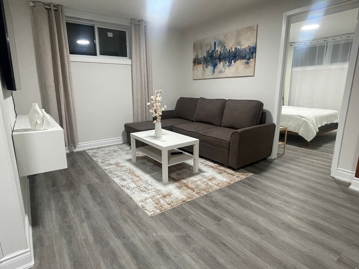 **Zabranjene su zabave i okupljanja ** Novouređeni, veliki, prostrani i udobni stan 10 minuta od aerodroma. Potpuno nova kuhinja, kupatilo sa tušem, laminatni podovi, ugradni ormar, dnevni boravak i vešeraj. Uživajte u udobnom bračnom krevetu! Prikladno za porodice i mirna okolina. U blizini SquareOne, Sherway Gardens, MiWay, autoputeva i centra grada. U blizini su šoping, supermarketi i rekreacioni centri. Potpuno zaseban ulaz. Besplatno parking mjesto na prilazu.