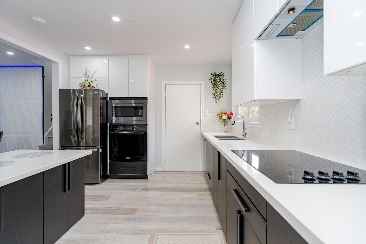 Zapanjujuća kuća u Etobicokeu udaljena je svega nekoliko minuta od aerodroma i centra grada. Ovaj prostrani otvoreni koncept, retki luksuzni moderni dom, je predivno uređen i uređen. To je potpuno opremljen dom i imaće sve što biste ikada mogli da poželite za kratkoročni boravak. Savršeno za velike porodice i grupe! najmanje 25 godina da rezervišete. Soba 1 bračni krevet (širine 180-220 Soba 2 bračni krevet (širine 150-179 cm ) i još jedan bračni krevet (širine 150-1 Soba 4 kraljica bez pravila za žurke ili prekomernu buku. Ovo je miran smeštaj