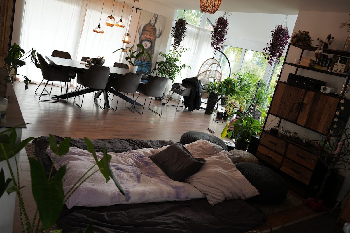 Brand-new luxury house: 300m2, 3 floors, 4 bathrooms, dual kitchens, separate entrances, huge garden. Open spaces, abundant light, 3 mins to S-bahn Mahlsdorf. LIDL across the street, REWE, Rossman, cafeterias and restaurants nearby. Surrounded by greenery and lakes. We're a sociable couple around 30 with two friendly dogs and cats on-site. Ideal for young, sociable guests who value personal space. Book now for a serene and stylish stay! For any further questions feel free to pm me. :)