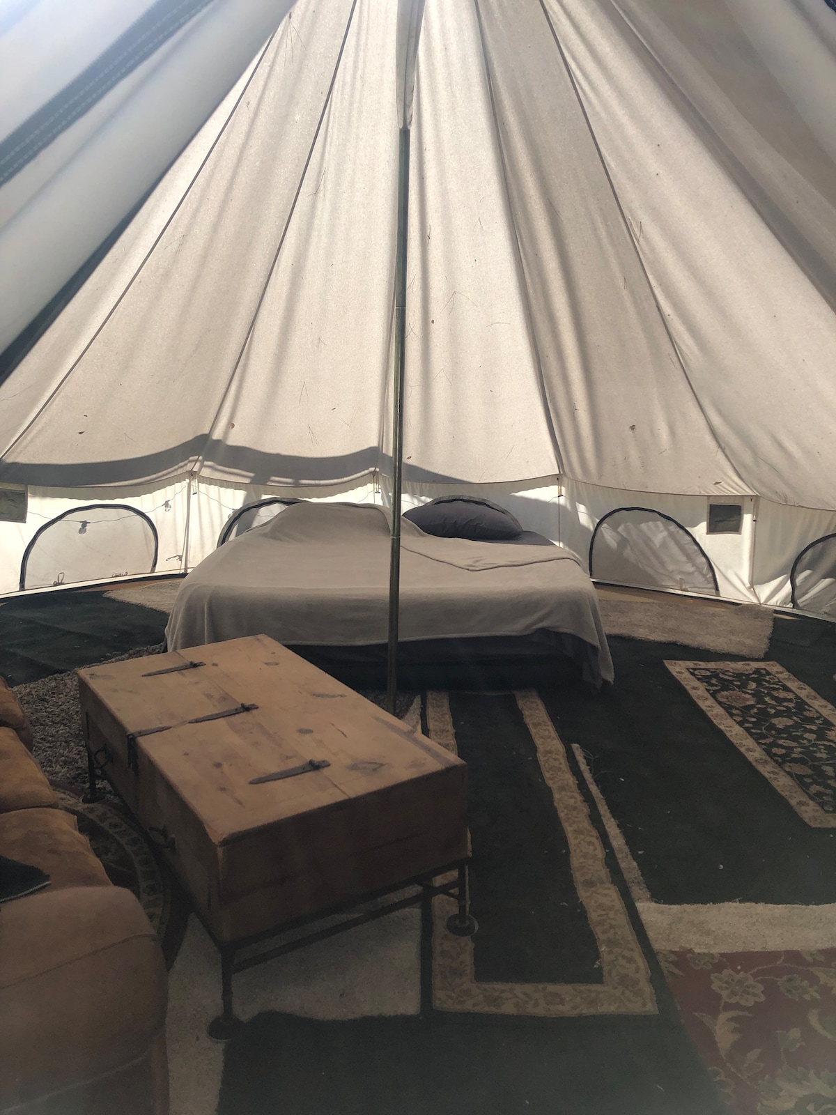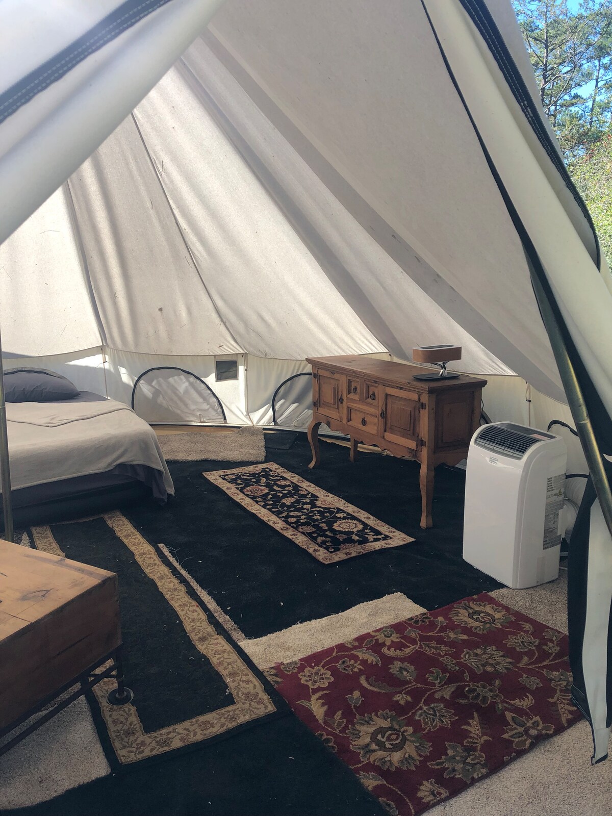 Boravite u glamping šatoru od 6 metara okruženom borovima i kedrovima. Uključuje bračni krevet, dve sofe na kojima može da spava po jedna osoba, a dodatni kreveti su dostupni za 20 USD po krevetu. Šator ima klima-uređaj, mali frižider, besplatan Wi-Fi i pristup zajedničkom kupatilu i tušu. U sklopu objekta je besplatan parking. Na imanju se nalaze i drugi objekti, tako da ćete tokom boravka možda sresti druge goste. Tor, naš nežni dugorogi bik, luta našim susjednim ograđenim zemljištem, pa dođite da ga pozdravite!