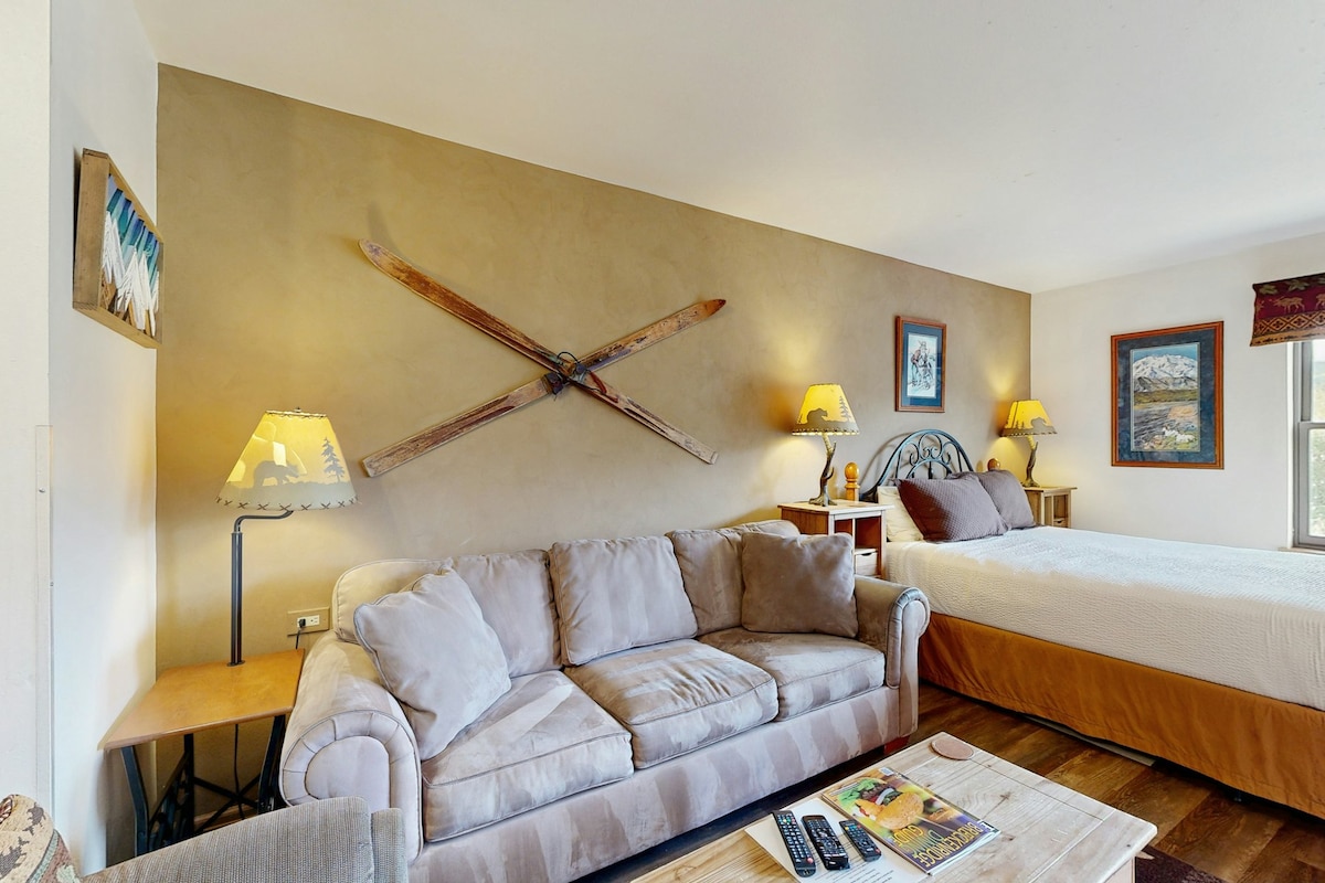 Return from a day on the mountain and store all your gear in a private locker before kicking up your feet in front of the fire in this relaxing condo. The location allows you to spend a quiet evening watching a movie in front of the fire or taking a quick walk downtown to shops and restaurants, or doing a combination of everything!