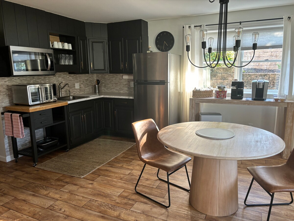 Udoban apartman za goste povezan s glavnom kućom u brvnari. Potpuno opremljena kuhinja, trpezarija, šporet na drva, udoban bračni krevet, ugradni ormar, igre, 100 filmova. Tuš kabina u ravnini poda i ugrađeno sjedište. Vešernica sa vratima do terase, stolovima u bistrou, ognjište. Svodna dnevna soba ima sjedište na izvlačenje za jednog spavača, TV [ROKU, You Tube TV, HULU, Netflix, Amazon, Disney], Blu-Ray plejer i Google Nest Mini. Uživajte u doručku kao što su svježa jaja, sok, mlijeko, hljeb, kafa, čaj i naša domaća pica.