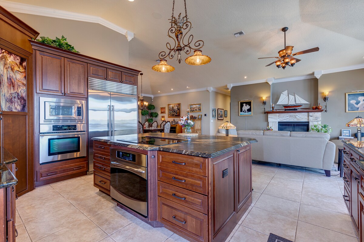 Pobjegnite u ovaj zadivljujući smještaj uz obalu prikladan za kućne ljubimce na Floridi! Ova ograđena oaza nudi pogled na vodu koji oduzima dah, posmatranje delfina i privatno pristanište. Uživajte u igraonici sa vazdušnim hokejem i video igrama, kao i u najmodernijem bioskopu. Opustite se u elegantnim stambenim prostorima i gurmanskoj kuhinji. Napolju plivajte u bazenu, uživajte u hidromasažnoj kadi ili pecajte s mola. Samo 40 minuta od aerodroma Orlando i sat vremena od tematskih parkova. Rezervišite sada za vrhunski odmor!