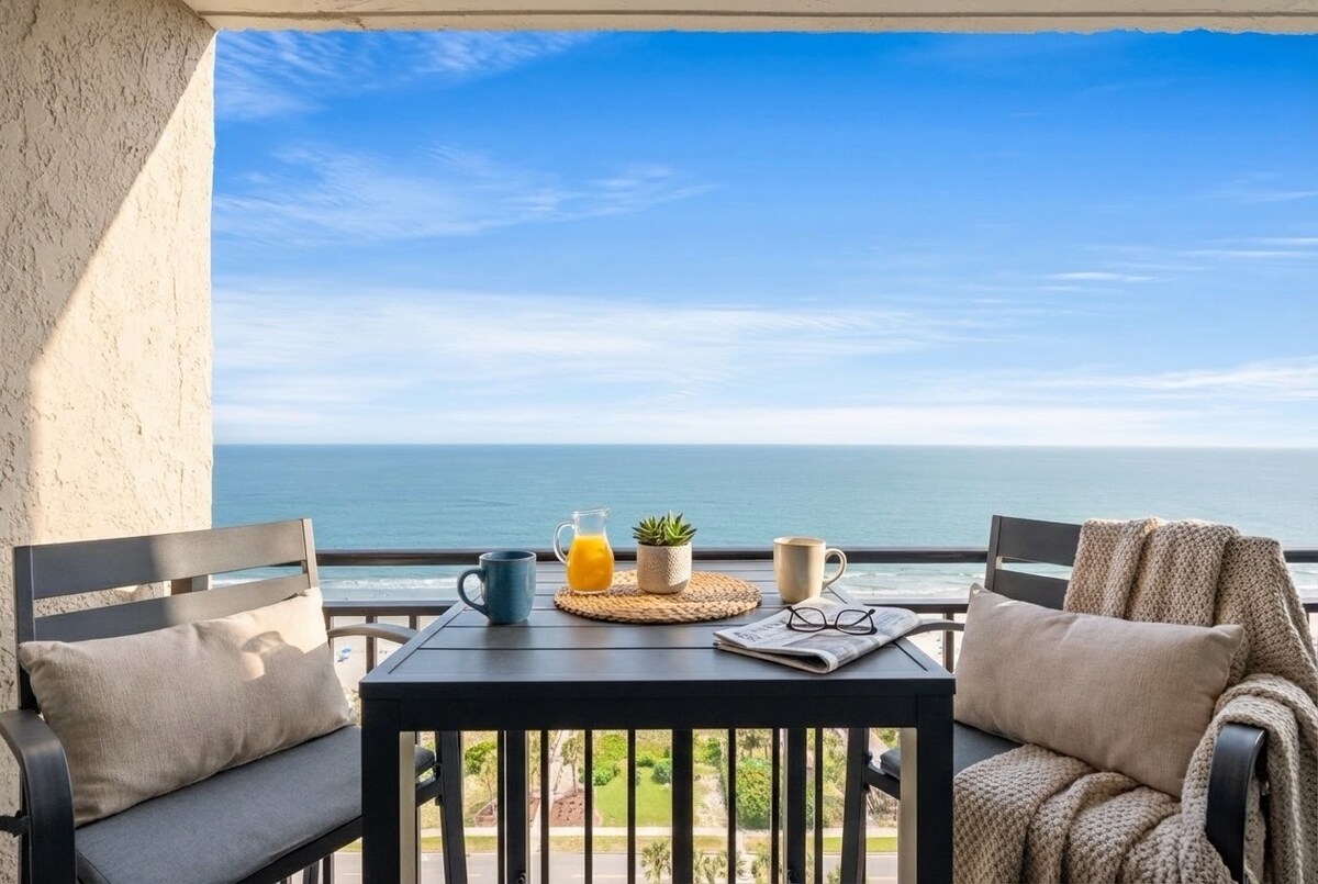 Udoban studio na plaži! Prekrasan pogled na okean bez prepreka iz vašeg bračnog kreveta u kutku! Nalazi se visoko na 17. spratu unutar odmarališta The Palace. Pogledajte obalu koja se prostire kilometrima! Besplatan Wi-Fi i parking. Pristup više bazena sa mjehurićima i đakuzija, bar, restoran, arkada i putt putt, sve na licu mjesta. Samo nekoliko minuta od aerodroma. Na pešačkoj udaljenosti/kratkoj vožnji do sladoledžinica, restorana, barova, zabave i razonode!