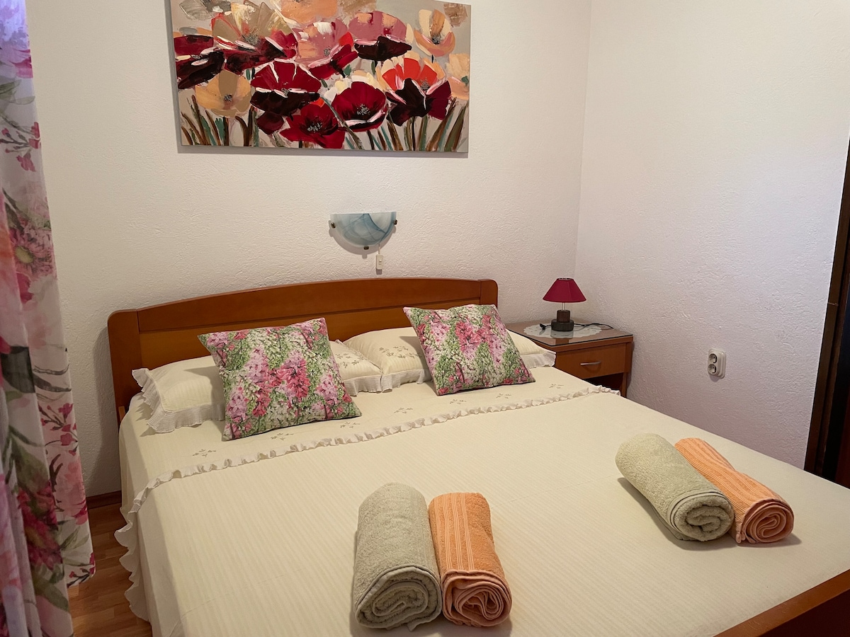 Garsonjera je relativno blizu gradskog trga (5 minuta hoda) sa prelepim pogledom na grad i more. Ima i malu terasu i balkon sa kojeg možete da uživate u pogledu. Ispred kuće imamo privatni parking u slučaju da stignete automobilom. Stan je na drugom spratu, a mi živimo u prizemlju, pa ako vam nešto zatreba, uvek će biti neko ko će vam pomoći. Stan je renoviran 2020. godine.