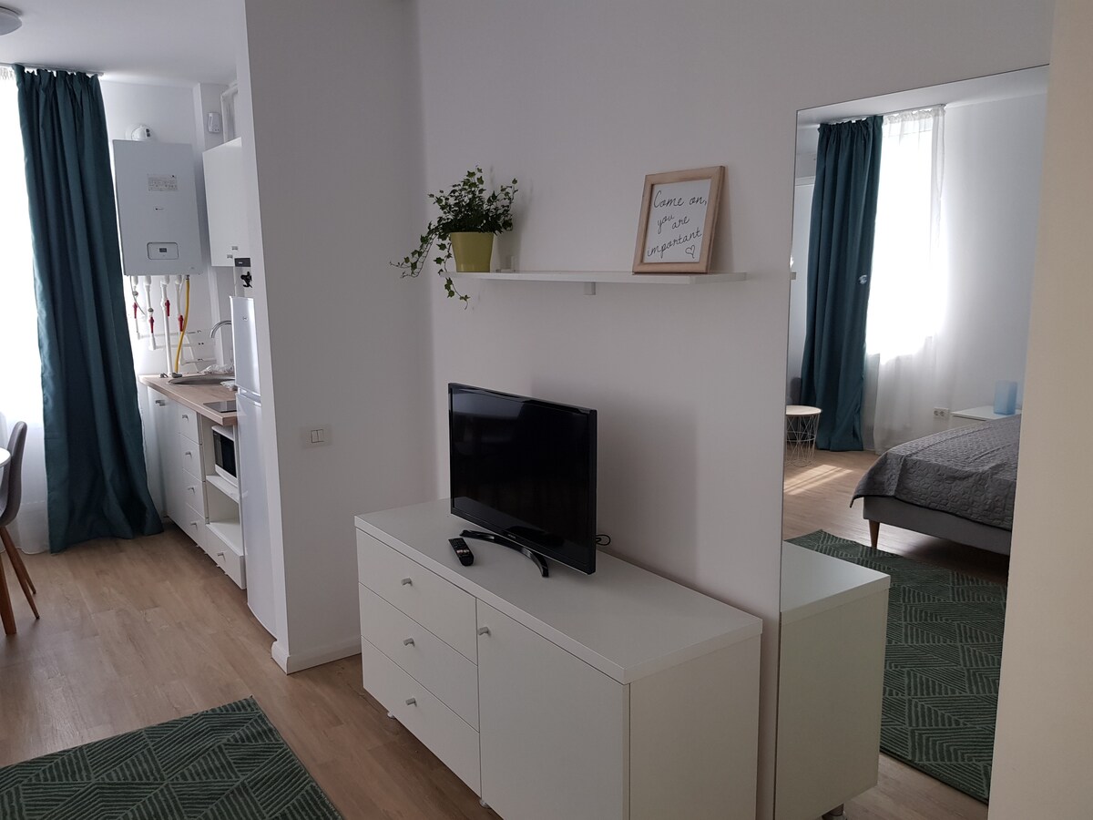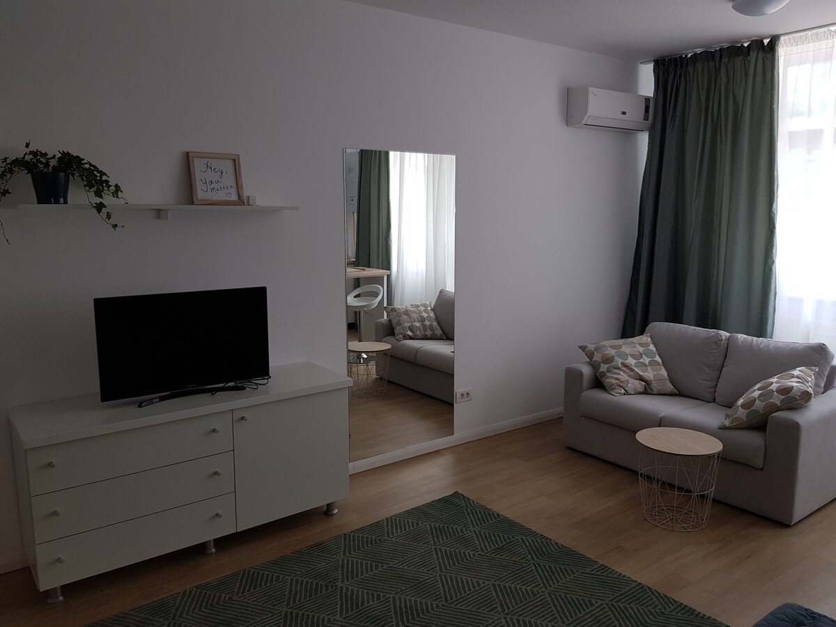 Moderan stan, koji se nalazi u butik hotelu u Voluntariju, na samo nekoliko minuta od Bukurešta. Prostor kombinuje udobnost privatnog stana sa sadržajima hotela: elegantan dizajn, bračni krevet, potpuno opremljena čajna kuhinja, brzi Wi-Fi. Idealno za parove, turiste ili poslovne putnike koji žele mir, ali i brz pristup centru grada.