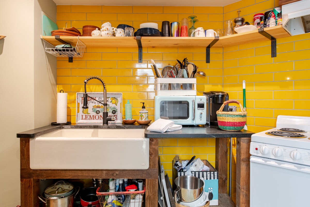Naša gostinjska kuća od 1200 kvadratnih stopa sa 2 spavaće sobe je tiha, čista, udobna i privatna. Neka svjetlost obasja dok uživate u pogledu na prostranu baštu i livadu koja okružuje objekat! Prozori na plafonu katedrale, kao i prozor u zalivu, osvjetljavaju ovaj apartman otvorenog tlocrta koji se sastoji od dnevnog boravka, trpezarije i kuhinje. Ova gostinjska kuća može da primi četiri osobe. Ako je potrebno više prostora, posjetite naš drugi smještaj Mirno, spokojno i na osami na airbnb.com/h/blueroom360mnm.