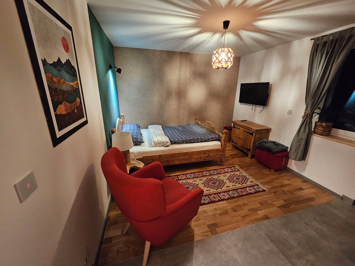 Divan renoviran stan sa terasom u blizini planina i aero klubom u Bielsko-Biała, gdje možete pronaći sve što vam je potrebno i osjećati se kao kod kuće. Kuhinja i kupatilo visokog standarda i kvaliteta. Svi potrebni uređaji i posuđe su dostupni. Idealno za poslovne, sportske događaje i kulturna okupljanja u kratkom periodu. Potpuno opremljen pametnim TV-om i Wi-Fi mrežom. Najbliže prodavnice (Żabka i Lewiatan) udaljene su 150 metara.