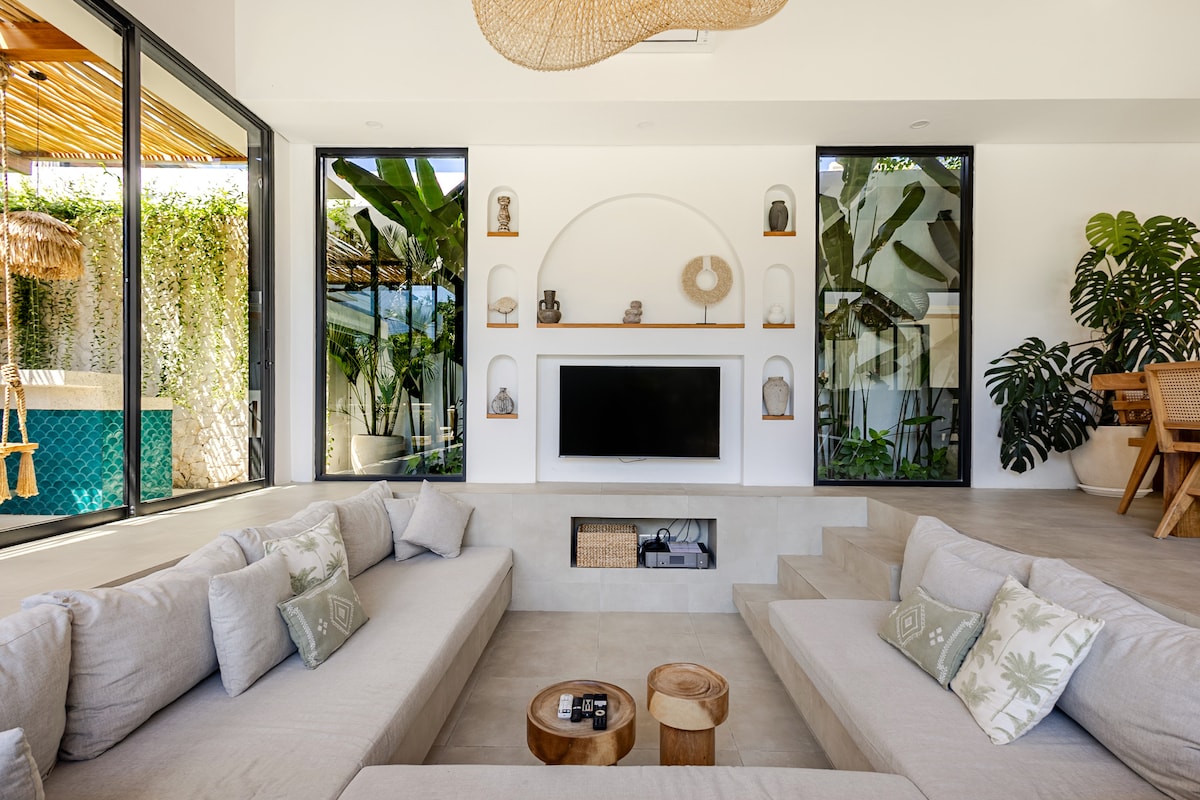 Vila za medeni mesec sa ogromnim bazenom i kokosovim vrtom. Odlična lokacija na pješačkoj udaljenosti od svih restorana i kafića u Cangguu. Ogroman privatni bazen i sunce ceo dan, savršeno za sunčanje na terasi. Dve spavaće sobe imaju bračne krevete, klima-uređaj i 55-inčne televizore + kupatila. Dnevni boravak sa klima uređajem, kompletnom kuhinjom, trpezarijom i Bluetooth zvučnikom. Osoblje svakodnevno dolazi radi čišćenja i stol za masažu u kući – savršen način za opuštanje. Okruženi smo najboljim kafićima i restoranima na Baliju, na fantastičnoj lokaciji na plaži Eho i Batu Bolong.