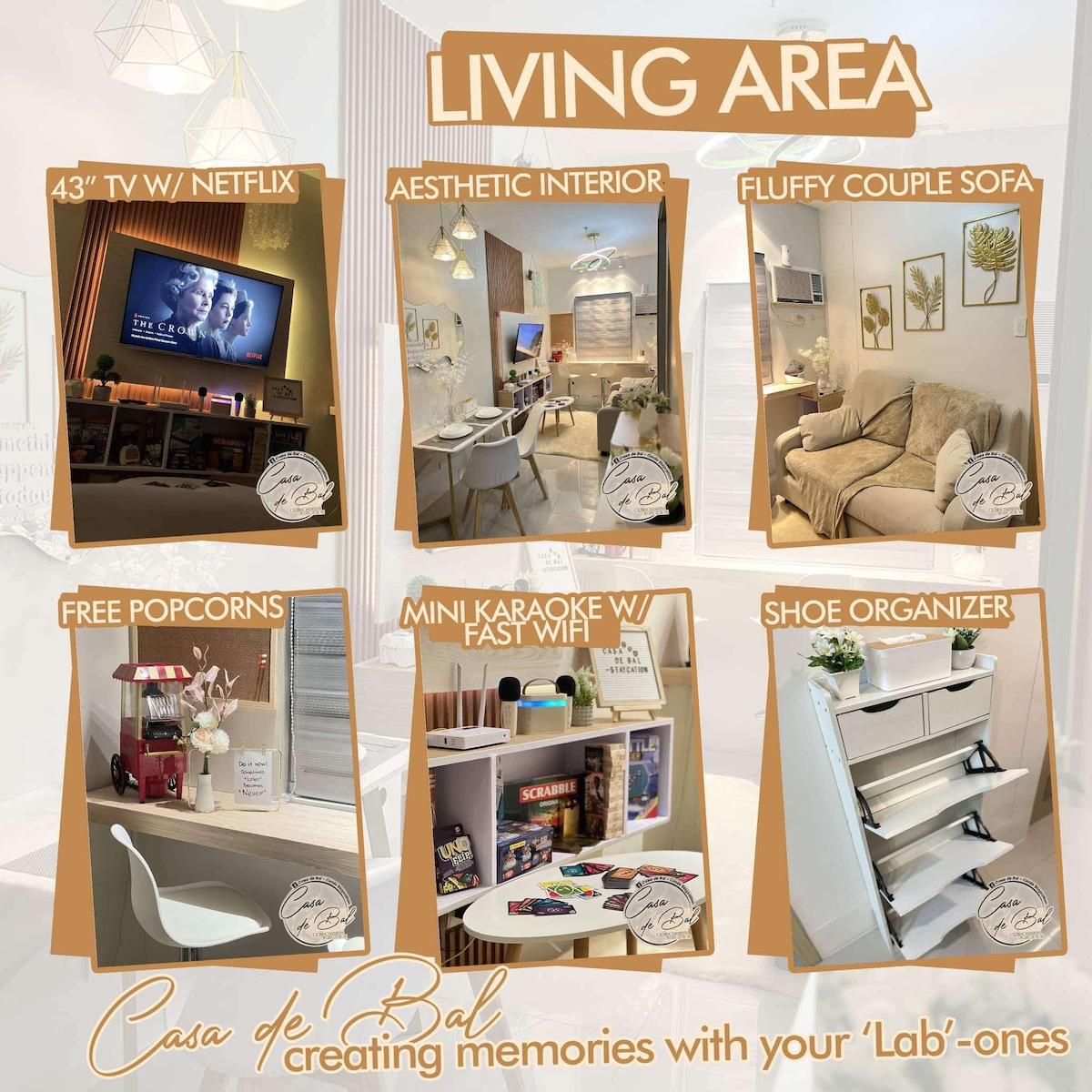 Šta će vam se svidjeti • Estetski ambijent: unutrašnjost dostojna kondominijuma • Vrhunski sadržaji: uživajte u brzom Wi-Fi-ju, PlayStation-u, karaokama, B. Igre i Netflix-u za beskrajnu zabavu • Raspored spavanja: 2 kreveta na izvlačenje dvostruke veličine i prostrani kauči u sali • Sadržaji u stilu odmarališta: pristup 3 bazena, prirodnoj bašti i elegantnom dnevnom boravku Naše obećanje • Otvorena komunikacija non-stop koja će vam pomoći u bilo kom trenutku tokom boravka Udaljenost pješke do • SM Fairview • Ajala terase • Robinsons