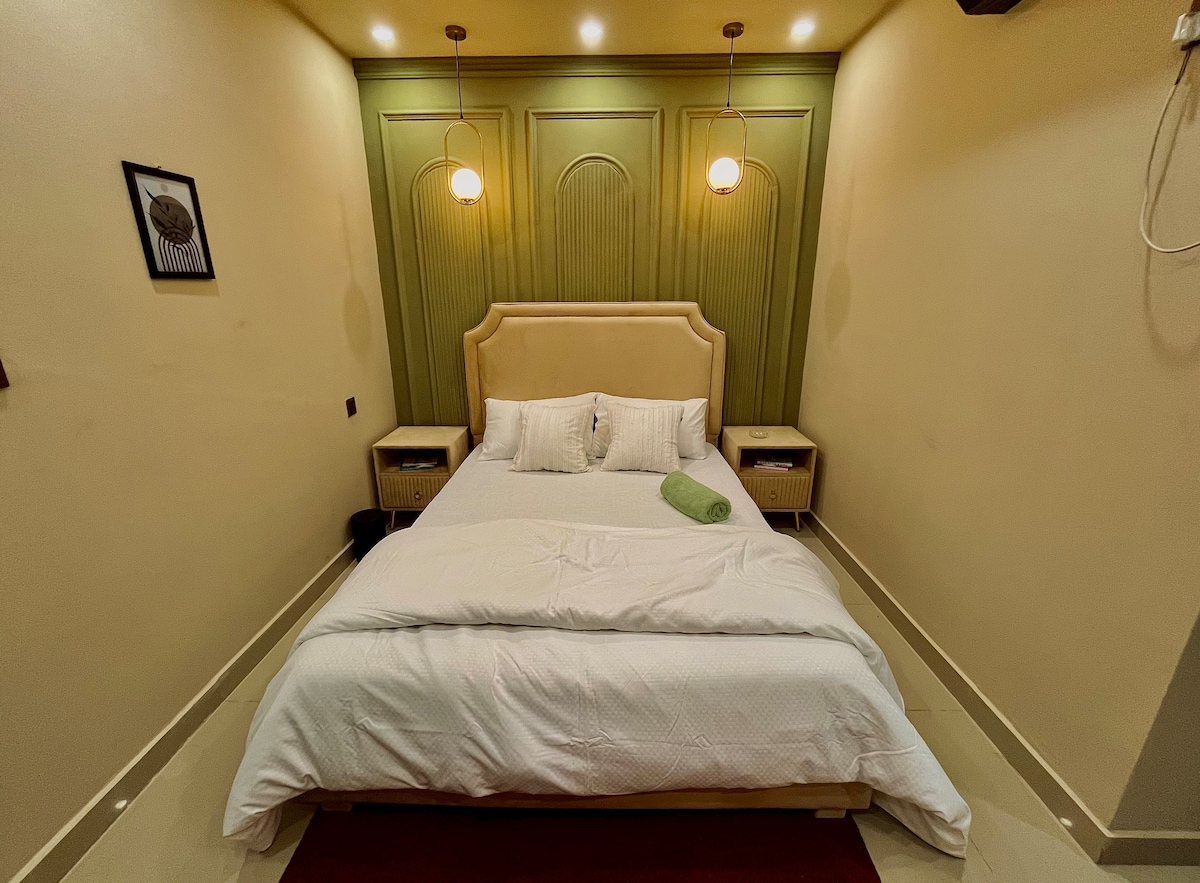 Unmarried couples are strictly not allowed. Modern open-layout NOX Studio featuring a king bed, cozy sofa, chilled AC, and chic wooden & raw design accents. Relax with a Smart TV and Wifi, Spacious washroom with an open wardrobe. Please note: no kitchen is available. Perfect for small families, friends, travelers or couples seeking comfort and style. Located in a secure building, close to shops, mosque, and banks combining modern aesthetics with convenience for a memorable stay.