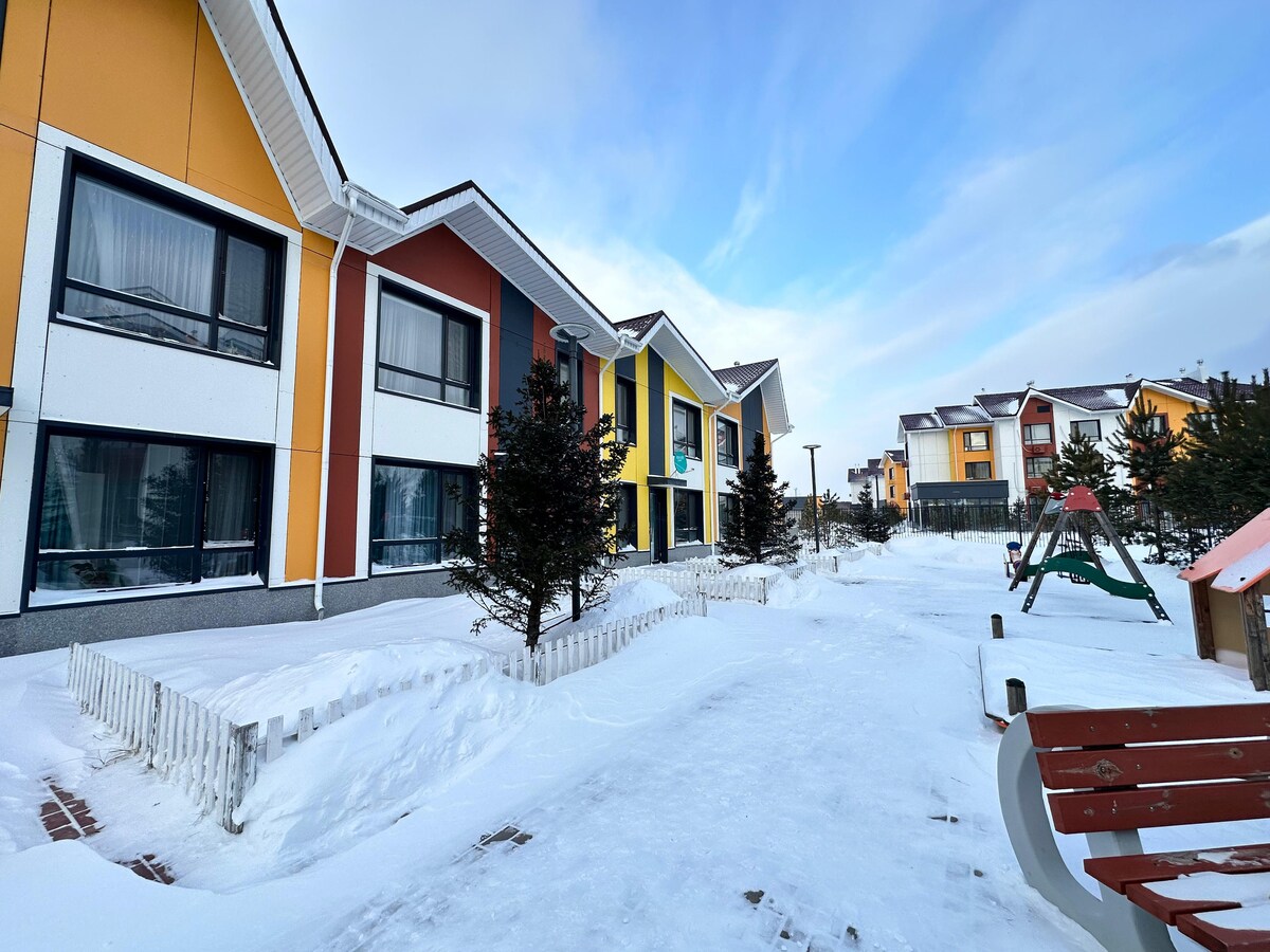 Uživajte u elegantnom doživljaju u srcu grada. U jednom od elitnih kompleksa Prominad Burabai,sa čuvanim, ograđenim prostorom sa danonoćnim obezbjeđenjem. Kuća u nizu se nalazi dvjesto metara od jezera, a na pješačkoj udaljenosti nalazi se zoološki vrt, panoramski točak, zabava za djecu, iznajmljivanje bicikala, terenskih vozila i motornih sanki. Kuća ima sve što je potrebno za udobnu mašinu za sudove, čist krevet, peškire i kućne aparate.