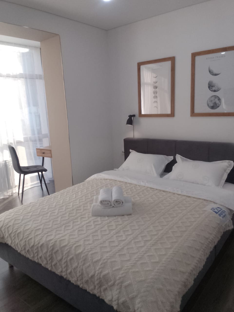 A clean, bright apartment with 3 sleeping places (a separate bedroom + a children’s room on the second floor, and an L-shaped sofa in the living room), with access to a private terrace. Ceiling height is 4 meters. Located in the Promenade Burabay cottage community. The complex features a barbecue area, a children’s playground, guarded parking with video surveillance, and a walking alley leading to Lake Borovoe, just a 5-minute walk away (exit to Wyndham Beach).