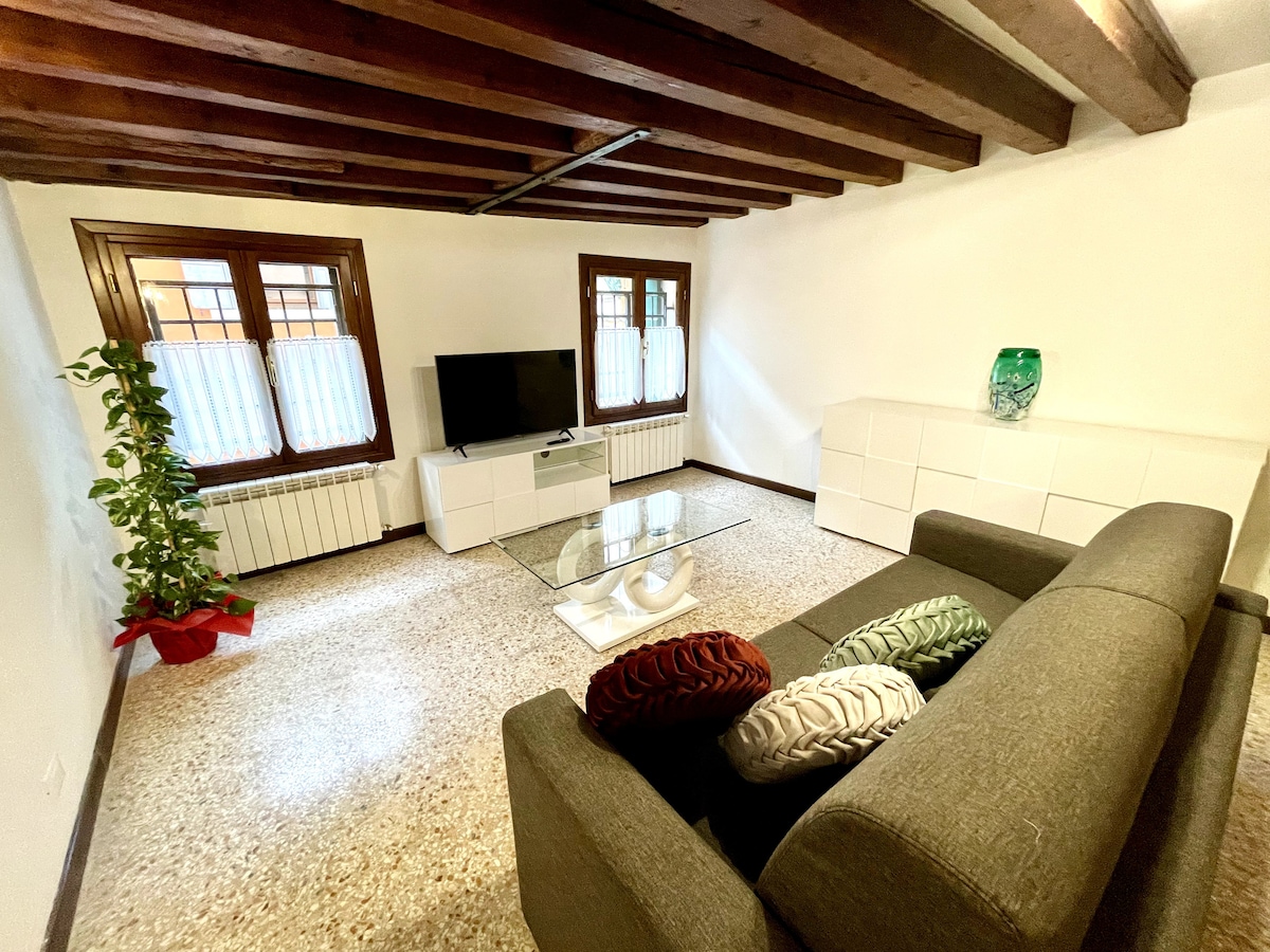 NE PROPUSTITE POGLED NA KANAL 👍 Prekrasan pogled na kanal će učiniti vaš boravak zaista jedinstvenim. Prostran i svijetao stan koji se nalazi u srcu Venecije, savršen za doživljaj grada kao pravi Venecijanac. Elegantne završne obrade, veliki dnevni boravak i potpuno opremljena kuhinja nude udobnost i prostor. Sveže voće i povrće i supermarket su na samo nekoliko minuta hoda. Idealno i za duže boravke, sa kaučem i namjenskim radnim prostorom.