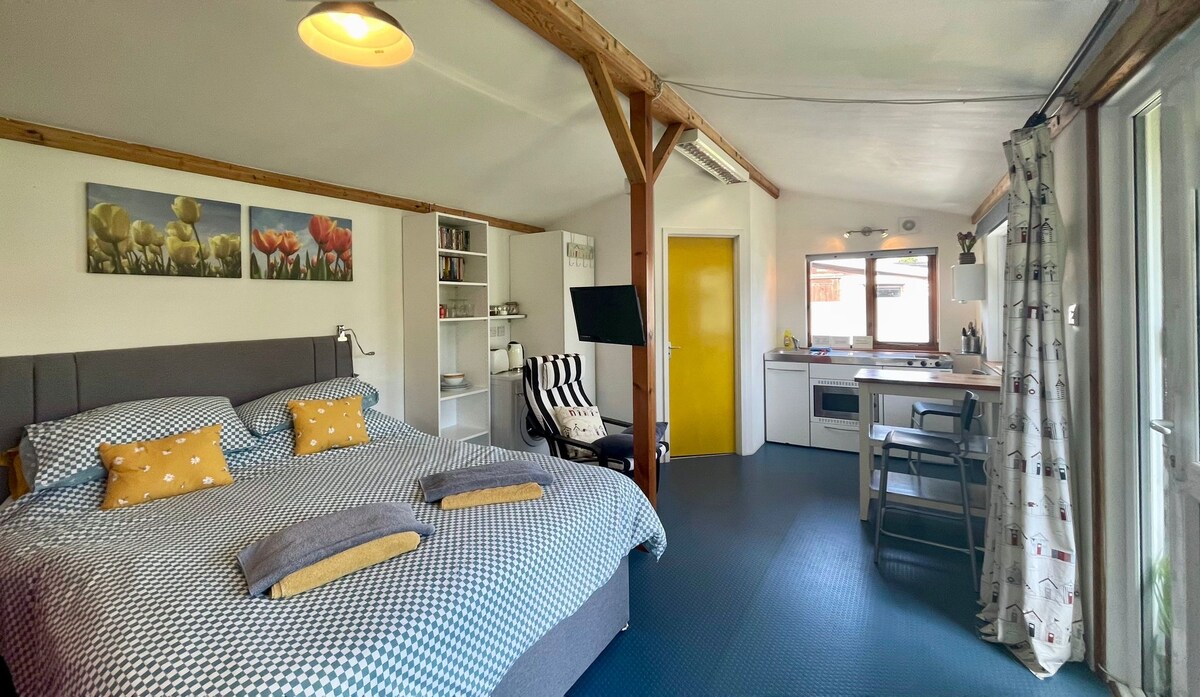 Mudfordski baštenski studio sa kupatilom i kuhinjom, sopstvenim baštenskim prostorom. Novi bračni krevet i visok standard dekoracije. Idealno mjesto za pristup plaži Avon i luci u Mudefordu ili plaži Mudeford Spit i Hengistberi Hed. Takođe preko Stanpit Marsh SSSI i rezervata prirode (2 minuta) ili do istorijskog grada Krajstčerča: 5 minuta automobilom ili 15 minuta hoda. New Forest (Lymington, Beaulieu, Brockenhurst) je u blizini. Bornmut takođe.