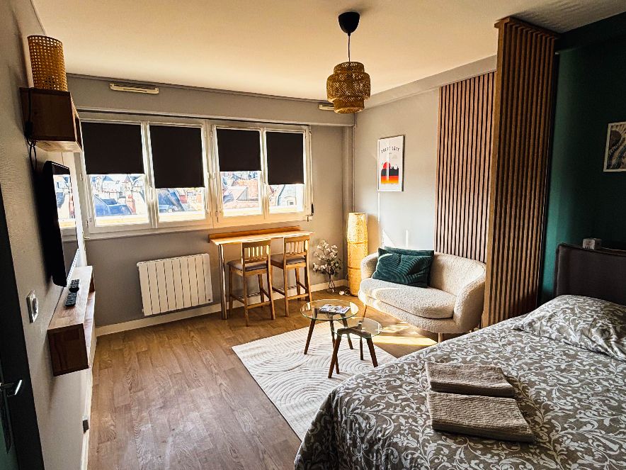-Logement de 42m2, situé à 5 mn à pied de l’hyper centre et de la place historique Saint-Sauveur - 3ème étage sans ascenseur - Parking gratuit dans la cour immeuble - Wifi gratuit - 1 chambre avec 1 lit double, linge de lit, penderie - Séjour-salon avec table repas, TV, canapé lit confortable pour 1 personne en plus - Cuisine toute équipée. Accueil thé /café (TASSIMO) - Salle de bain avec baignoire et wc. Linge de toilette, shampooing-douche