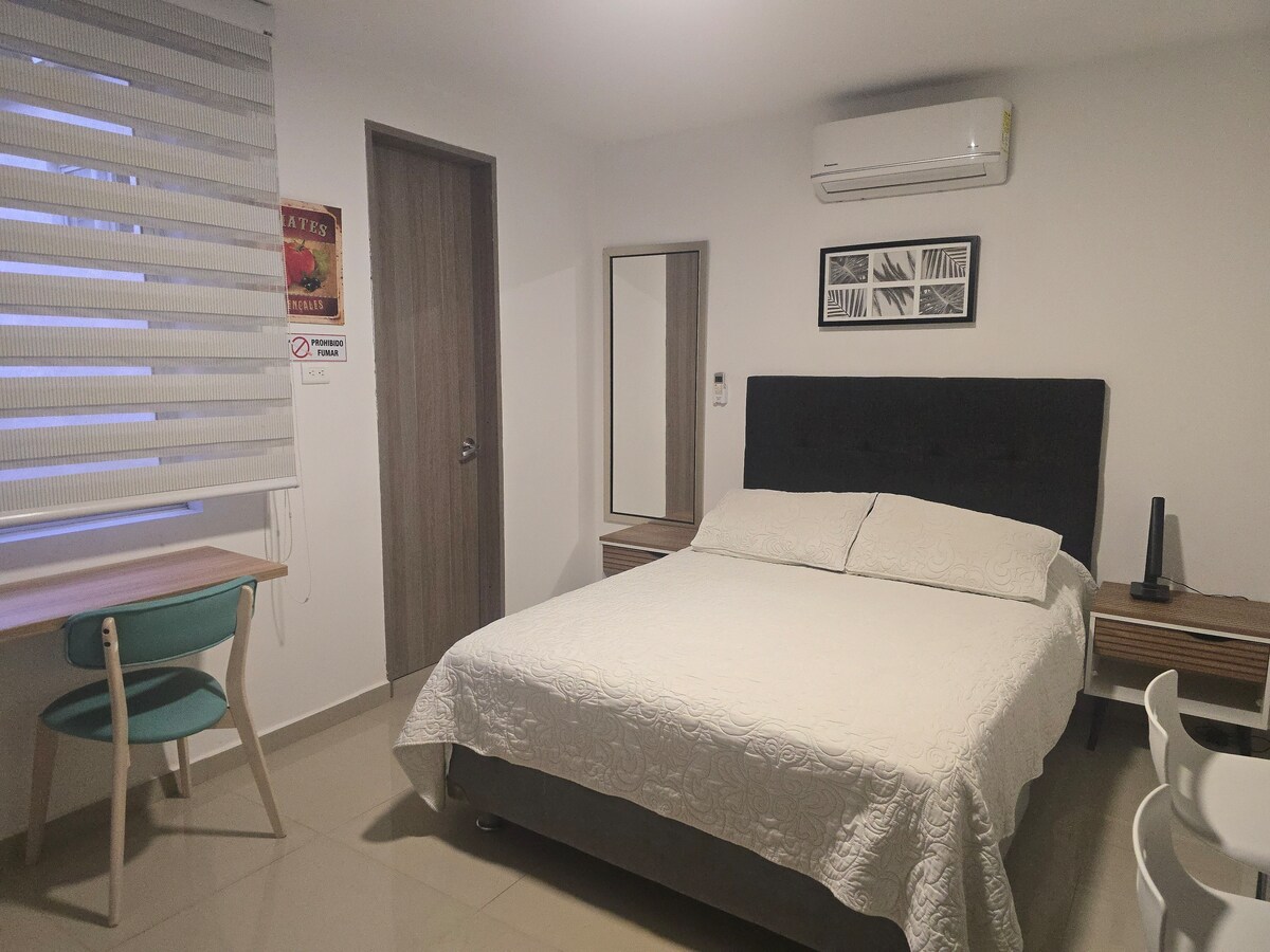 Uživajte u ljepoti i modernosti ovog mirnog smještaja koji se nalazi u centru grada. Ima: BRAČNI KREVET (ŠIROK 150-179 CM), POLU-ORTOPEDSKI dušek, KLIMA-UREĐAJ, pametni TV, RADNI PROSTOR, BRZI INTERNET, ormar. Kupatilo s WC-om, TUŠ S TOPLOM VODOM. Potpuno opremljena KUHINJA. SOFACAMA U blizini Panameričkih sudova, stadiona Pascual Guerrero, tržnih centara kao što su Palmetto Plaza, Mallplaza, Cosmocentro i glavnih gradskih klinika kao što su Imbanaco i Farallones.