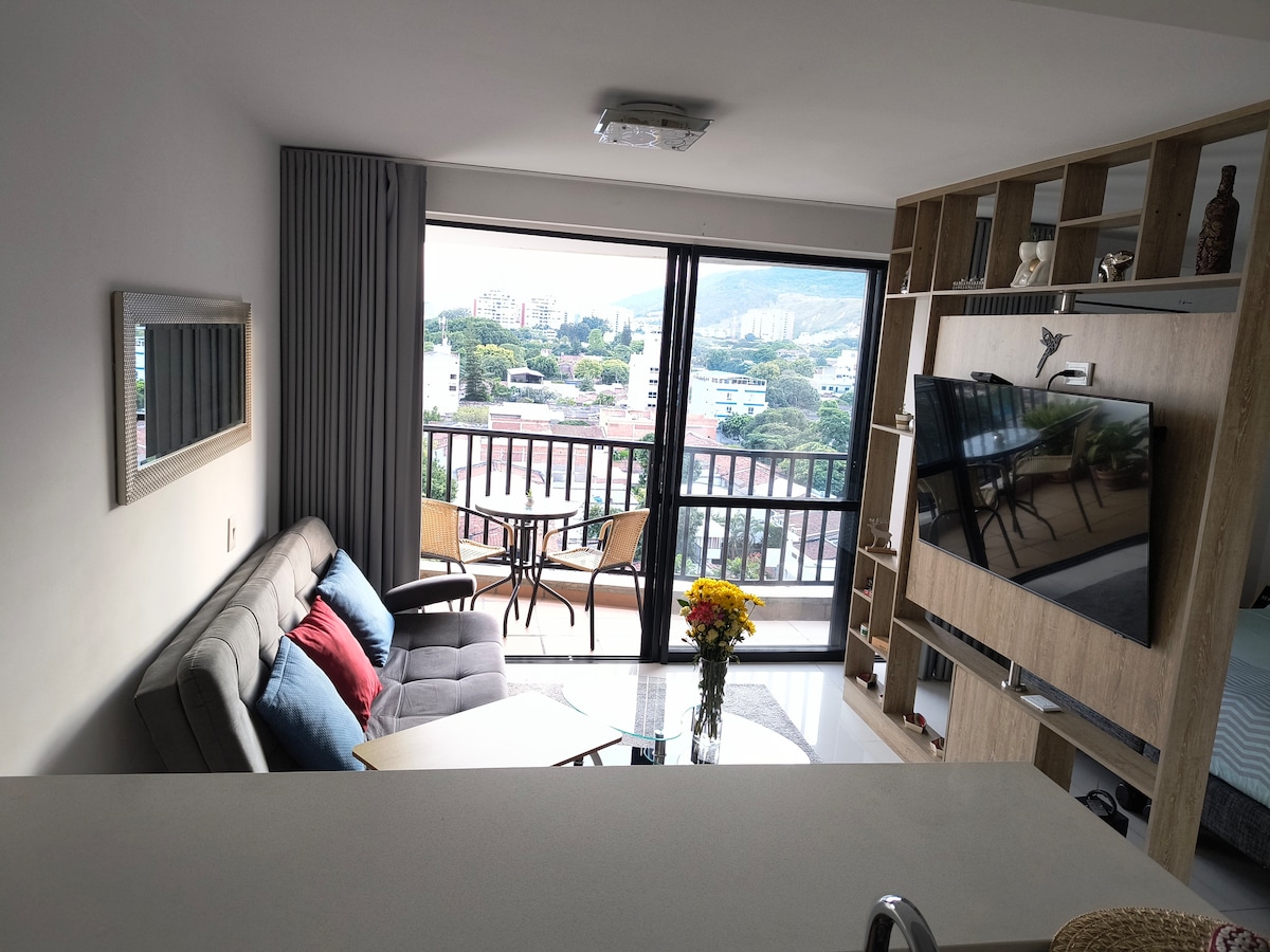 ✨Vive Cali desde el piso 12 con vistas únicas y brisa fresca🍃. Estudio moderno con cocina, sala, habitación y baño privado, cerca a todo. 🛏️Relájate con aire acondicionado, 2 TVs (sala y habitación), blackout y luces ambientadas. 🏊♀️Piscina y bañera al aire libre. ❌ sauna fuera de servicio 💪Terraza 360°, coworking y gimnasio. 🚗Parqueaderos comunitarios por orden de llegada. 🌃Cerca de restaurantes, centros comerciales, universidades y atractivos turísticos.