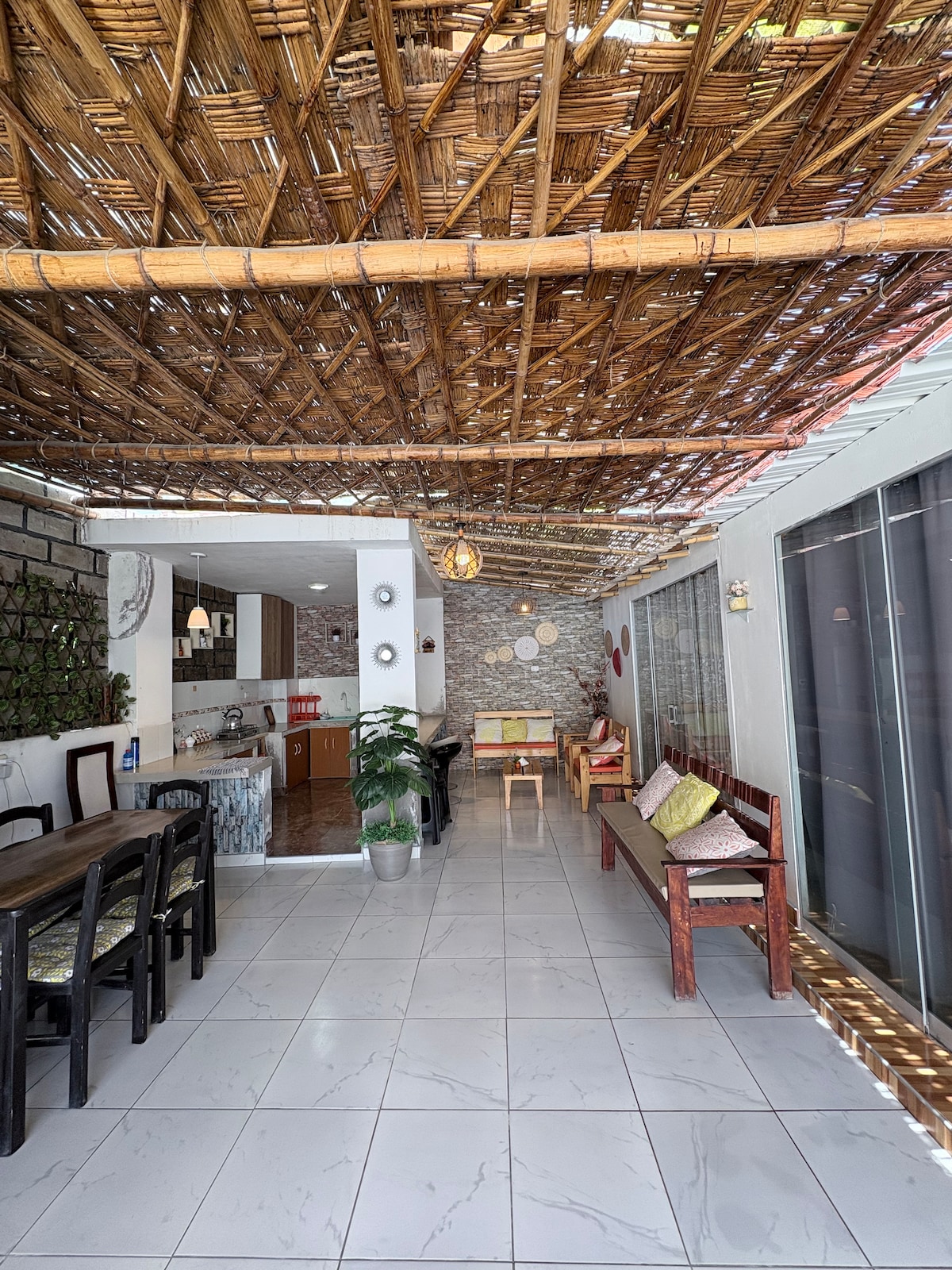 Casa Blanca familiar cuenta con acabados rústicos y bambú, crea un espacio de relajo, apto para temporada de verano 2023, cuenta ambientes ventilados y frescos adecuados para los días de verano, sala comedor, cocina, cochera para 01 vehículo y con desarenador en el patio, todo amoblada, si es de su preferencia se facilita mensajería para la cocina, pensando en la las condiciones climáticas y demás, pregunté por los tul personales para cama.