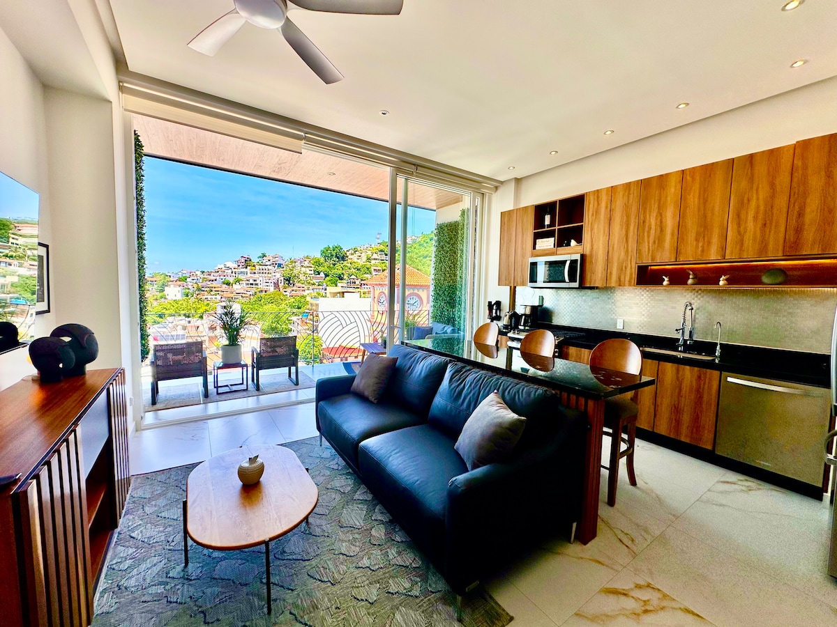 Ocean views, rooftop sunsets, and the best of Puerto Vallarta at your doorstep. This modern 1BR condo sits high on the 11th floor of the luxury 105 Sail View in the heart of Zona Romántica — three short blocks from Playa Los Muertos. Step outside to cafés, galleries, beach clubs, and nightlife… then come home to quiet, elevation, and sweeping Pacific views. Morning coffee on your balcony, afternoons at the infinity pool, evenings watching the sun melt into the ocean — floating above it all.