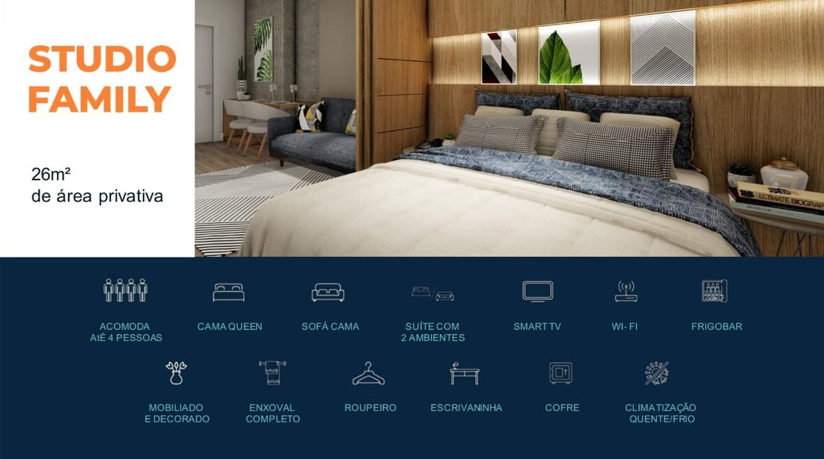 Apart-Hotel Canto Grande - STAN sa 1 SPAVAĆOM SOBOM Soba sa: Sofa sa tricama (bračni krevet i fioka), 32"LCD TV, plafon ventilator; Potpuno opremljena kuhinja sa: posuđem, posuđem, frižiderom, mikrotalasna rerna, aparat za sendviče, blender, kuvalo za vodu, termos i šporet sa rernom. Dvokrevetna soba sa bračnim krevetom: Box Bed (bračni krevet), podijeljeni klima-uređaj Kupatilo.