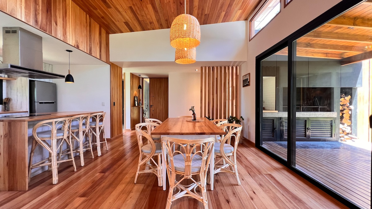 Pancha’s House is a cozy wooden home for 4 guests in Barrancas de San Benito. It features an integrated living–dining area with a full kitchen, 2 bedrooms, 1 bathroom and a toilet. Enjoy the gallery with grill, fire pit, and a leafy backyard. The gated community offers 24/7 security and amenities. Minutes from La Estafeta and Luna Roja Beach.