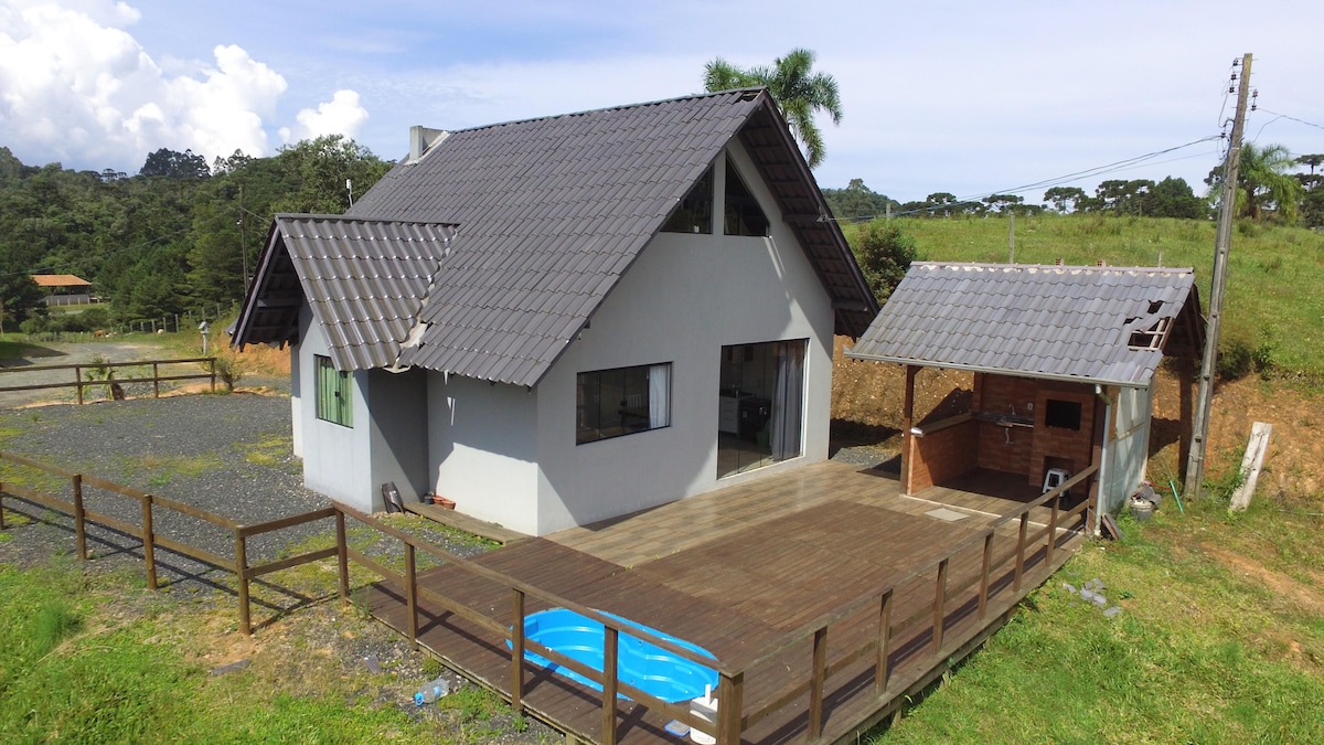 Planinska kuća za do 8 osoba sa kompletnom kuhinjom i prostorom za roštilj, sa velikim balkonom, podnim ognjem na balkonu, sa pogledom na jezero, kablovskom televizijom, kaminom, 10 km od centra grada i 3 km od supermarketa, mesto za šetnju pored prirode i biciklističke rute koja prolazi ispred. Imamo Wi-Fi u planinskoj kući . Kućna kancelarija. Možete uživati u sajtu sa kioskom i pedalinom. Kuća za bebe lutke za decu. Vizualizujte na društvenim mrežama Sítio Vale do Lago