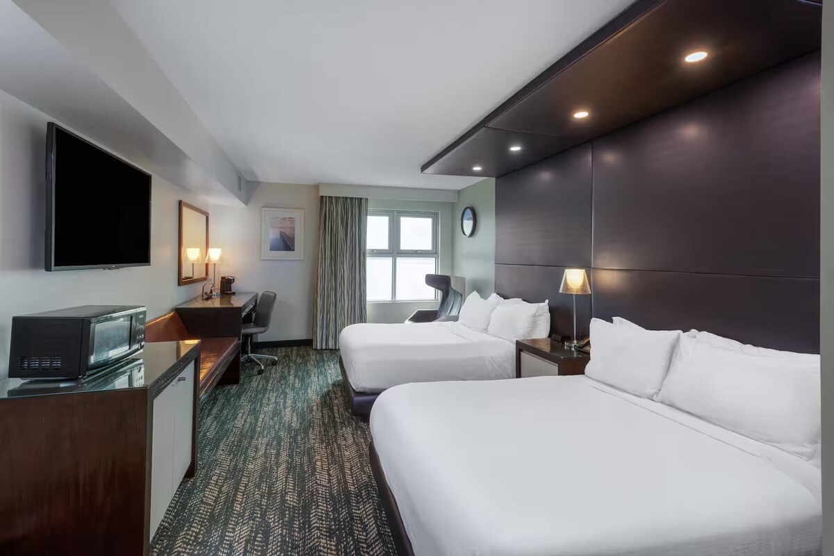 Zgrada uz obalu je jedan od četiri objekta koji se sastoje od hotela Showboat. Obala se nalazi uz jezero Seneka i gostima pruža pogled na jezero i slikovita brda koja ga okružuju. Ova hotelska soba na jezeru Seneka nudi dva bračna kreveta i balkon.