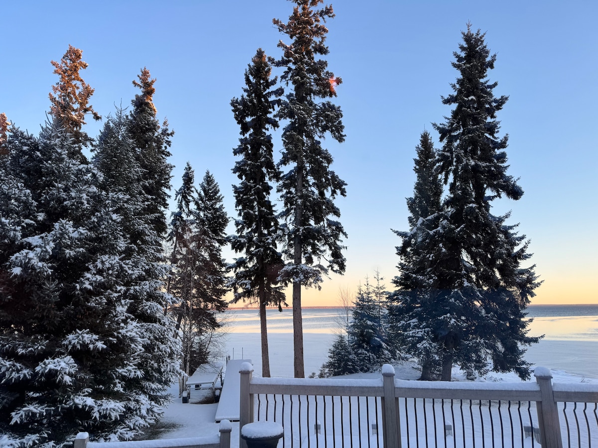 Rezervacija za ZIMU / PROLJEĆE/LJETO/JESEN 2026. Povedite cijelu porodicu u ovu sjajnu potpuno renoviranu brvnaru na obali jezera. Uživajte u vožnji motornim sankama, klizanju (moraćete da očistite lopatu), hodanju po snijegu, skijaškom trčanju, ribolovu na ledu i zimskoj šetnji. Ljetno plivanje, plaža, vožnja kajakom, lijena poslijepodneva. 5 spavaćih soba, 8 bračnih kreveta, 2 kupatila, mašina za pranje/sušenje veša. Otvorena funkcionalna kuhinja/sjedala na ostrvu =4 . Unutrašnji trpezarijski sto =10. Objedovanje na terasi = 10+. *** REZERVACIJE ZA PRODUŽENE VIKENDE SU NAJMANJE 3 NOĆENJA***