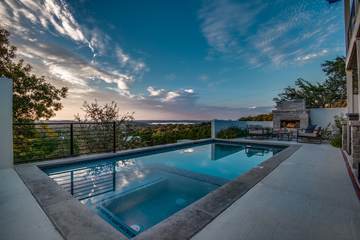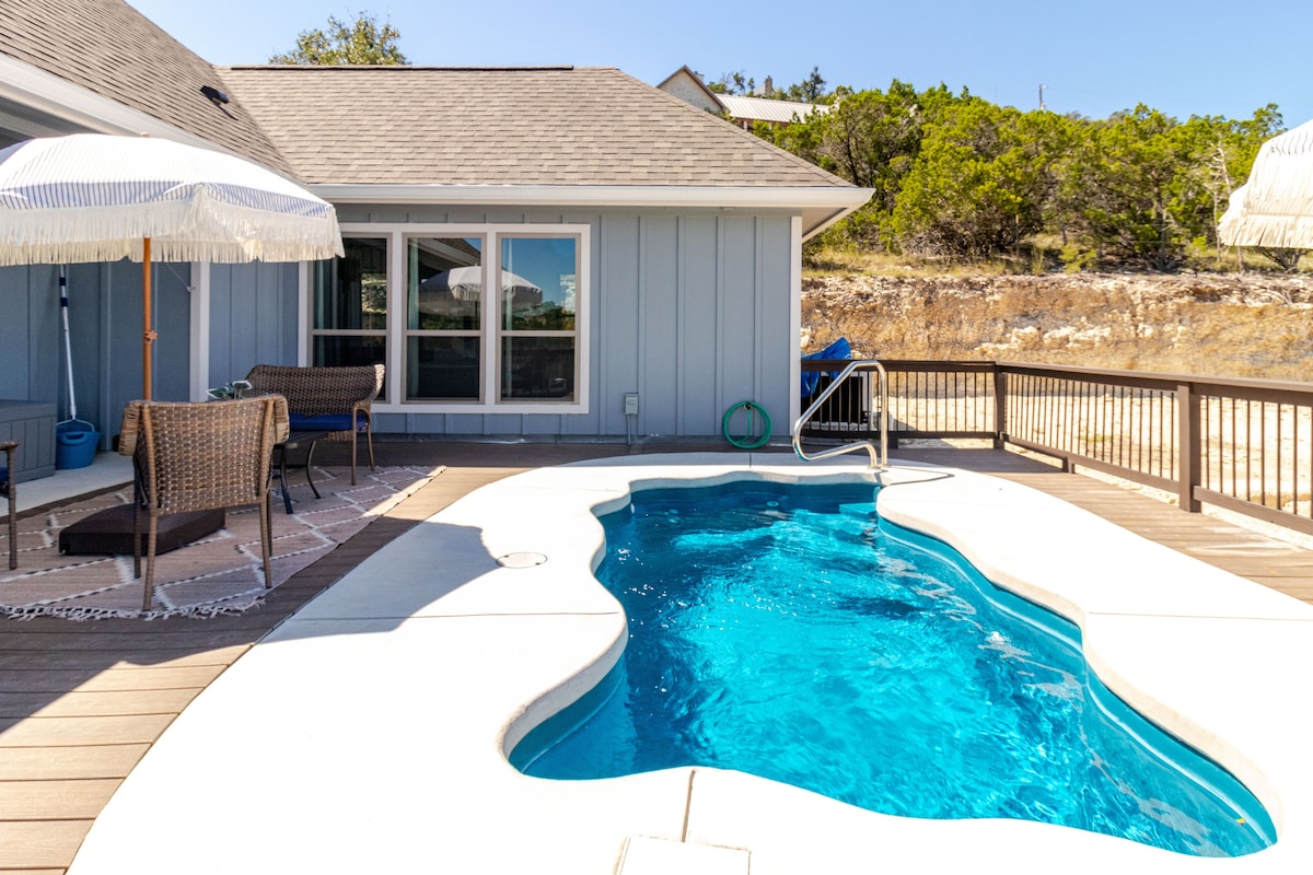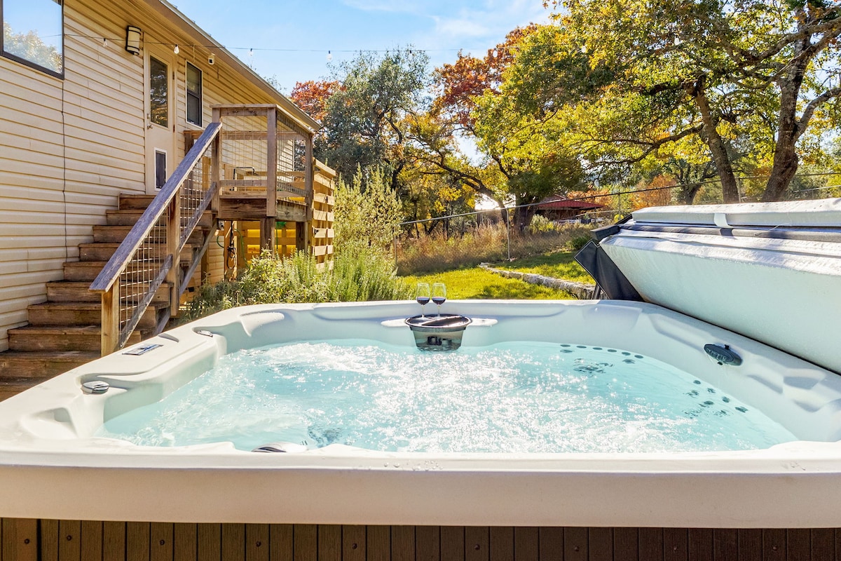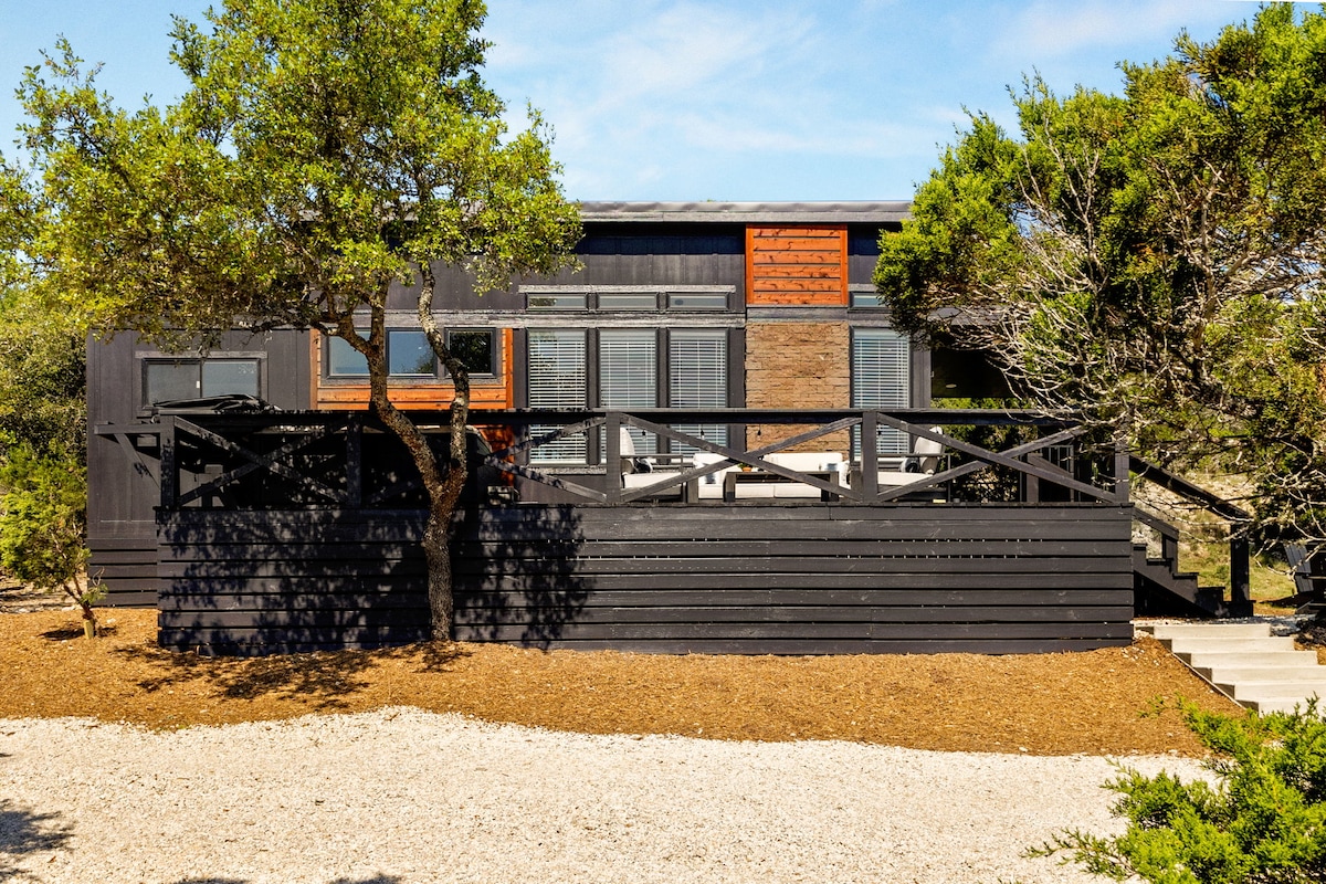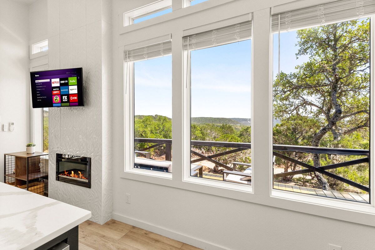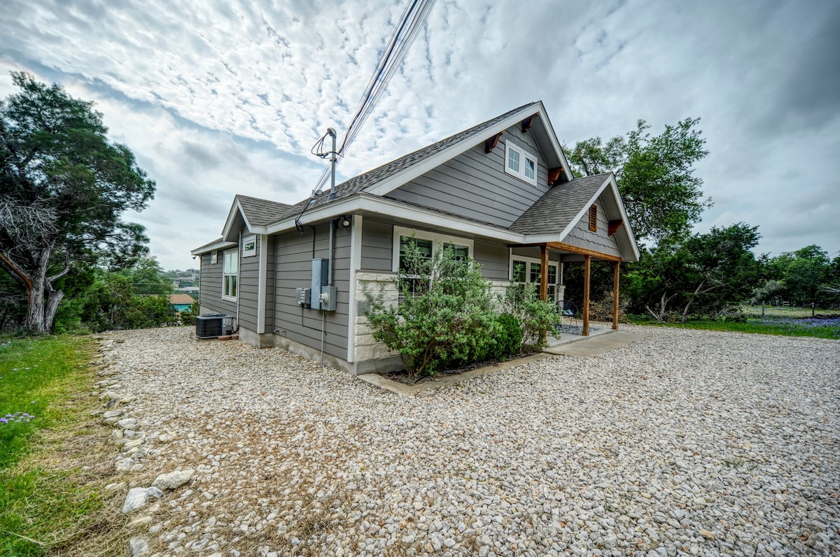 Uživajte u predivnom pogledu na naše utočište uz litice u Kanjonu, Teksas! Samo 7 minuta od jezera, naša kuća se može pohvaliti velikim dvorištem sa dovoljno mesta za sedenje, trpezarijskim stolom na otvorenom, grejalicama i osvetljenjem. Opustite se u sjenici sa ognjištem i daskom za sedenje. Roštilj, aparat za kafu, frižider za vino, šanker i kompletna kuhinja opremljena loncima, tiganjima, priborom za pečenje i priborom za jelo. Opustite se i podmladite se u srcu Teksas Hila.