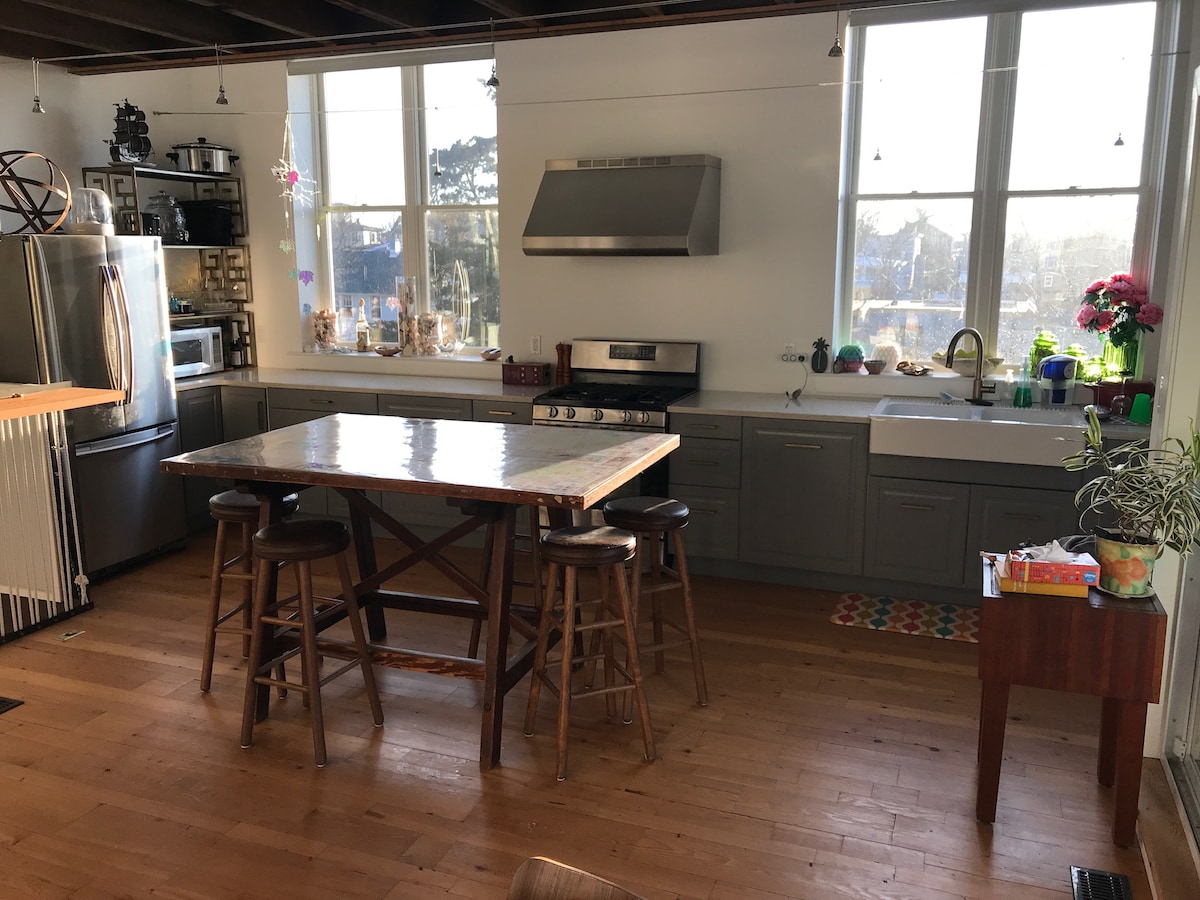 Jedinstvena trospratna arhitektonski dizajnirana kuća s vrtovima i drvećem na privatnoj slijepoj ulici, s pogledom na Kejp Ajl Krik i okolnu slanu livadu. Bračni krevet (širine 150-179 cm) + bračni krevet (širine 150-179 cm) na 3. spratu. 2 bračna kreveta (širine 150-179 cm) + 2 kreveta za jednu osobu na drugom spratu. Kamin (na gas), 5 paluba (2 ekrana), 5G I-net, pametni TV od 50inča (uključujući Netflix) + parking za 4-5 automobila. Nova centralna klima, kvarcne radne površine i uređaji. Oko 8 blokova do plaže. 5 do tržnog centra u centru grada. 5 blokova do luke (Lucky Bones/Lobster House).