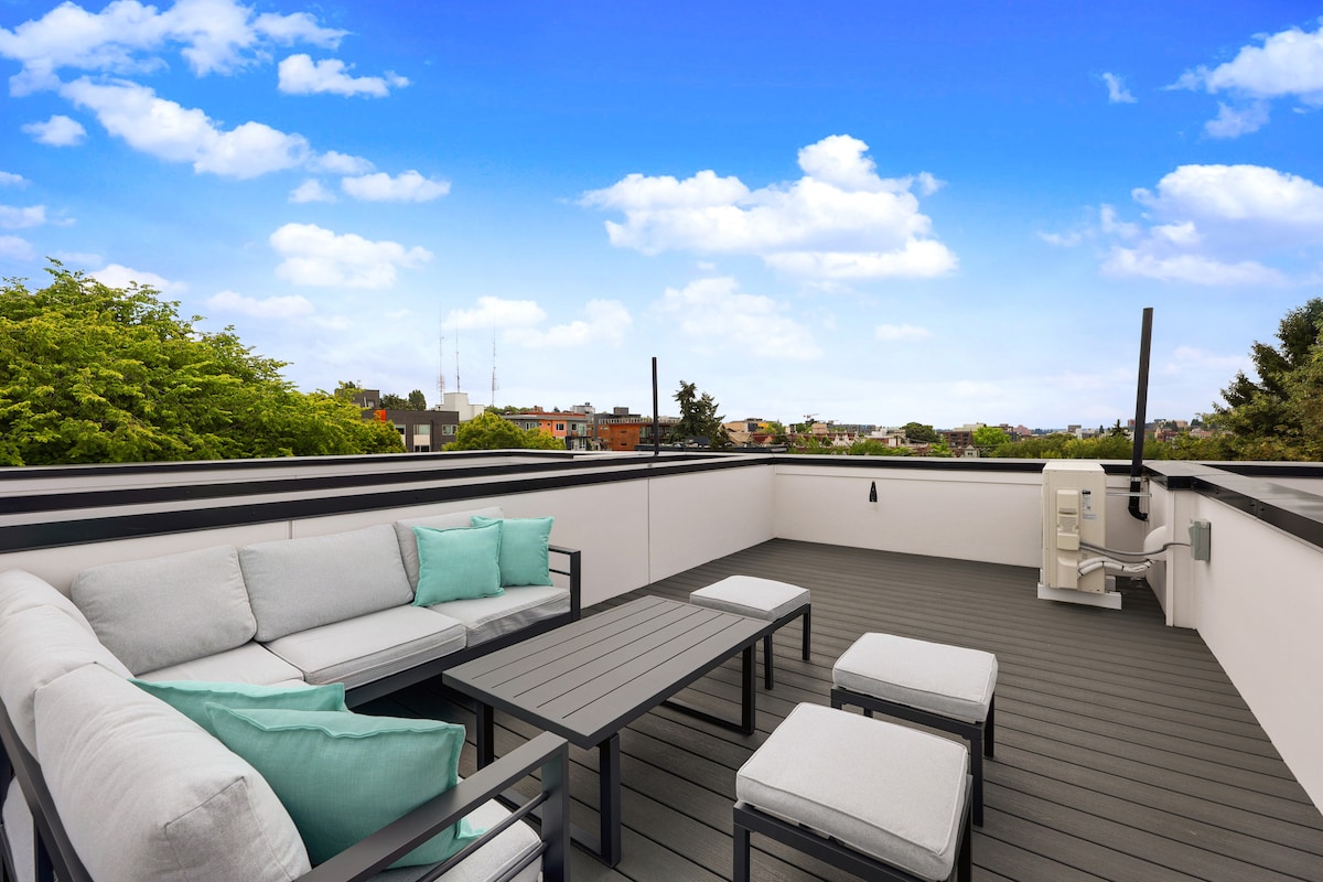 Uživajte u zadivljujućem pogledu na horizont Sijetla, Space Needle i olimpijske planine sa svoje privatne terase na krovu. Na korak od restorana i noćnog života Kapitol Hila, ova zelena kuća sa 4 zvjezdice spaja luksuz i praktičnost. Opustite se u glavnom apartmanu u potkrovlju, opustite se u privatnoj spavaćoj sobi na prvom spratu i uživajte u vrhunskim završnim obradama, kupatilima sličnim spa centrima i profesionalnoj kuhinji. Uz parkiranje izvan ulice, istraživanje Sijetla je jednostavno. Bilo da se radi o poslu ili u slobodno vrijeme, ovo utočište podiže vaš boravak.