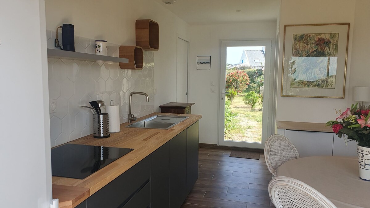 Kuća za 2 osobe, 32 m2 + ograđena bašta. 5mn hoda od sela, Menhirs, i biciklom, 5mn od plaža. 1 privatno parking mesto. 1 dnevni boravak sa otvorenom kuhinjom (keramičke ploče za kuvanje, mikrotalasna pećnica, frižider, domaćin, garderoba, TV), kauč, 1 krevet 2 osobe 140/190 1 tuš, 1 umivaonik, toalet, ostava 1 zatvorena bašta sa stolom, roštilj, 2 kreveta za sunčanje, Zabranjeno pušenje. Najmanje 2 noćenja i sedmično, u julu/avgustu🙂.
